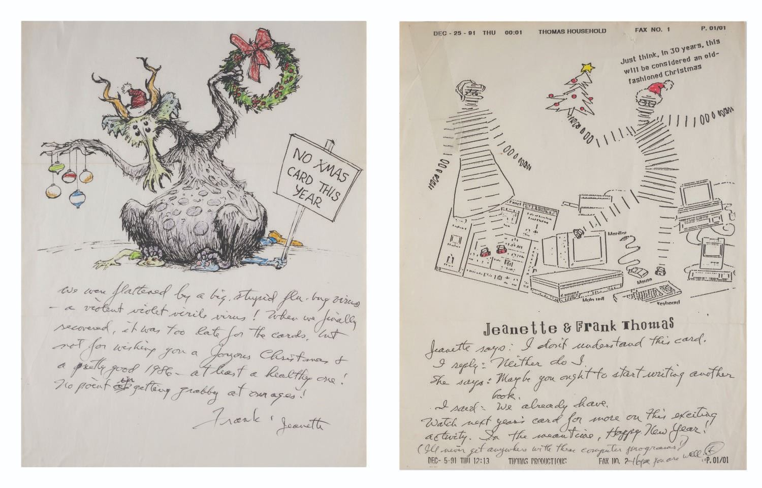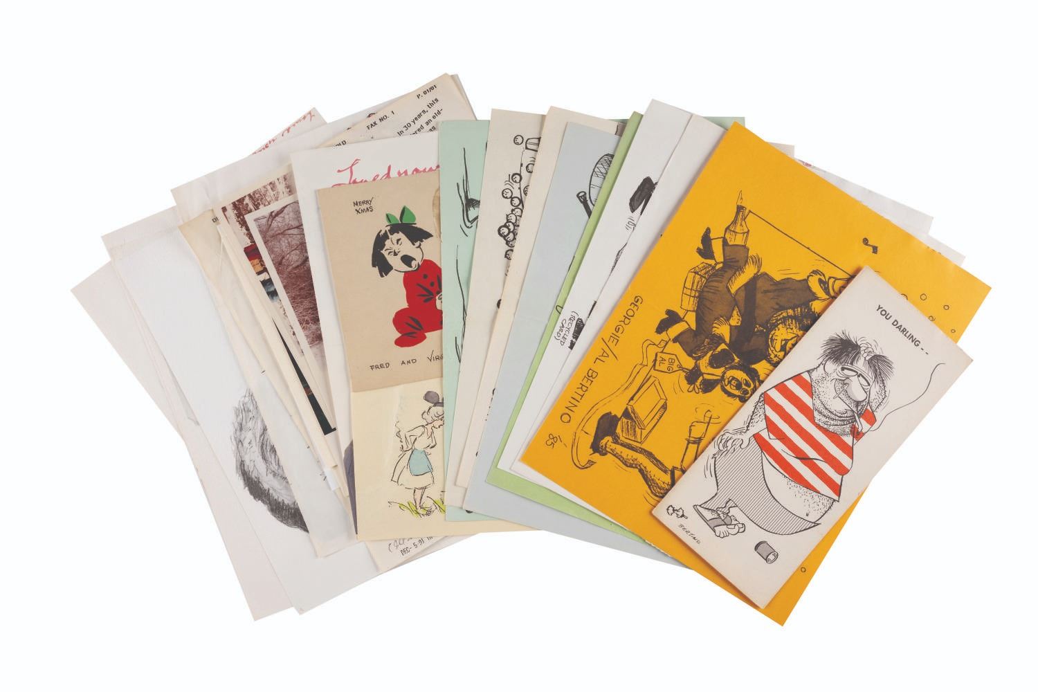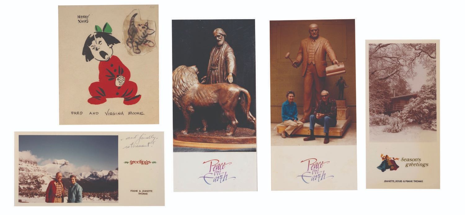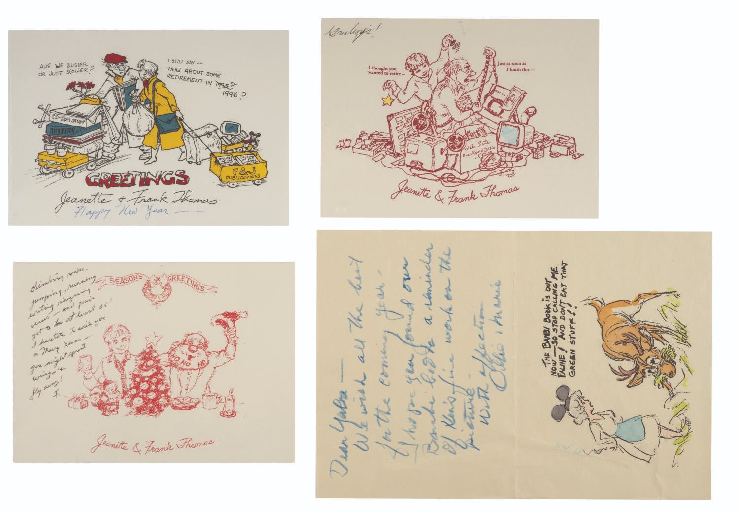 (Disney, 1979s-2000s) A collection of Walt Disney Studio Animators' Greeting Cards. This collection of 27 cards includes illustrated greetings from Ollie & Marie Johnston, Frank & Jeanette Thomas, Blaine Gibson, Fred & Virginia Moore, Al Bertino, and Clem Hall. Measuring 4.75"x5.75" to 11"x8.5", each piece is in good condition with a few spots of discoloration, surface wear, and edge wear.