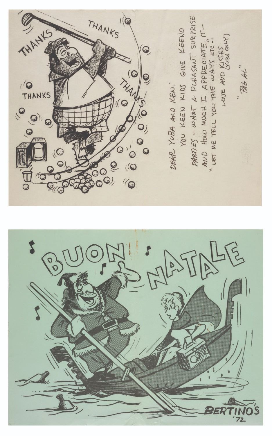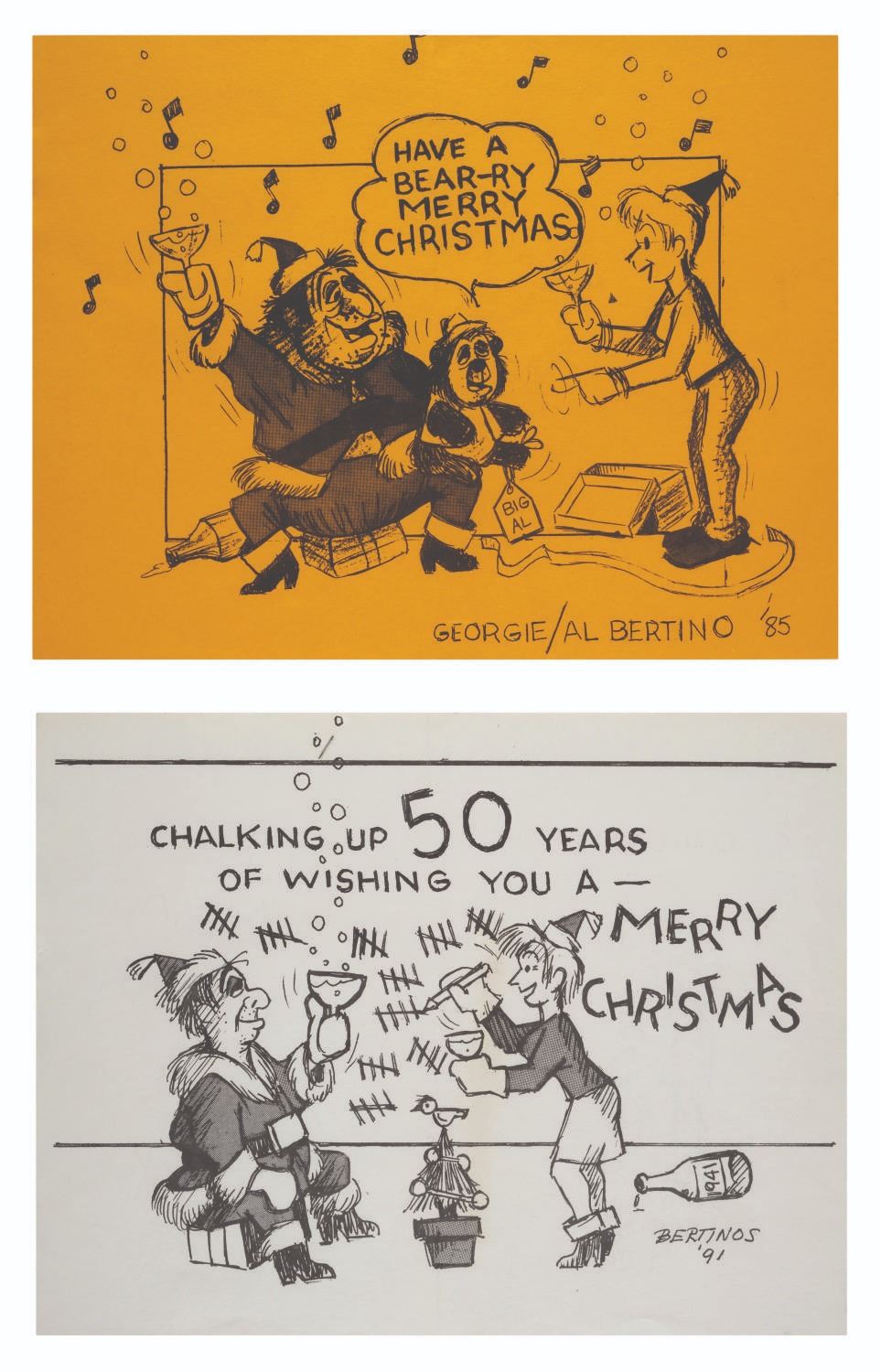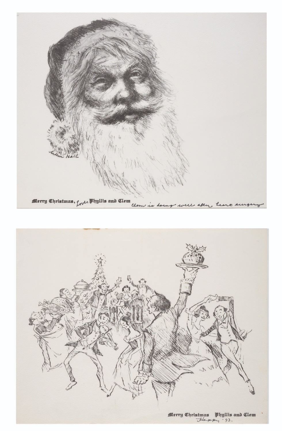 (Disney, 1979s-2000s) A collection of Walt Disney Studio Animators' Greeting Cards. This collection of 27 cards includes illustrated greetings from Ollie & Marie Johnston, Frank & Jeanette Thomas, Blaine Gibson, Fred & Virginia Moore, Al Bertino, and Clem Hall. Measuring 4.75"x5.75" to 11"x8.5", each piece is in good condition with a few spots of discoloration, surface wear, and edge wear.