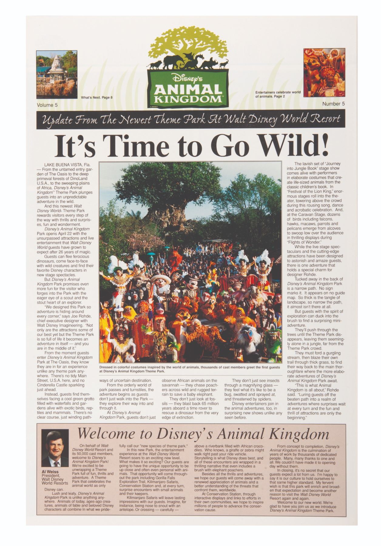 (Walt Disney World, 1997-2001) A collection of five Walt Disney World Eyes and Ears and Animal Kingdom newsletters. Highlights include a romantic Disney Vacation Club 5th anniversary ad featuring Mickey and Minnie, A Disney's All-Star Movies Resort ad, two "Monsters Inc." ads, and a Disney's Animal Kingdom opening article. Measuring 11" x 17", the newsletters are in very good to good condition with light spots of water damage, creases, and wear.