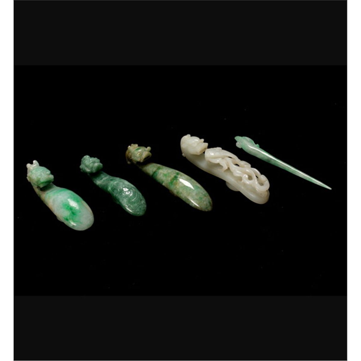 A Group of Five Jade Carvings, The stones varying in color from white to deep mottled green, exhibiting brown and apple green inclusions with natural fissure lines; the four belt buckles with dragon head terminals, two displaying carved chilong figures clambering upon each body; the fourth a small tapered hair pin topped by a simple yet stylized phoenix head. Qing Dynasty and Later, Longest: 3 1/2 inches (8.9 cm)