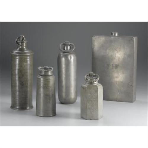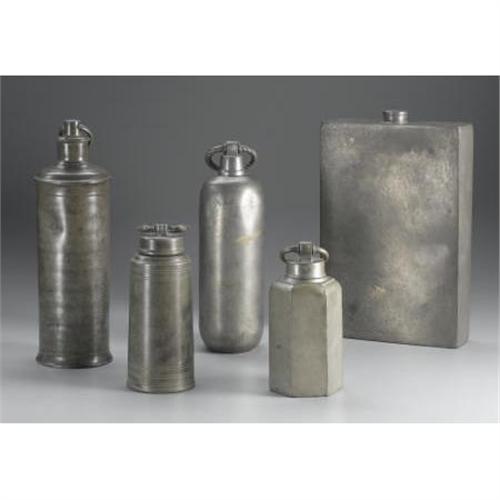 <B>A Group of Five Pewter Containers<BR></B></I>Various makers, Germany and England <BR>Nineteenth and Twentieth Centuries<BR>Pewter<BR>Various marks <BR>8.5 inches to 12.75 inches high <BR> <BR>Three of cylindrical form with screw off lids and bail handles. Another of tall rectangular form with small screw off lid made for Abercrombie & Fitch by Dixon & Son of London. Another of sexagonal form with screw off lid and bail handle. <B>Condition Report:</B> Normal signs of wear as appropriate with age; denting.<BR><BR><b>Shipping:</b> Hollowware/Pottery/Glass, Large (<a target="_blank" href="http://www.heritageauctions.com/common/shipping.php">view shipping information</a>)