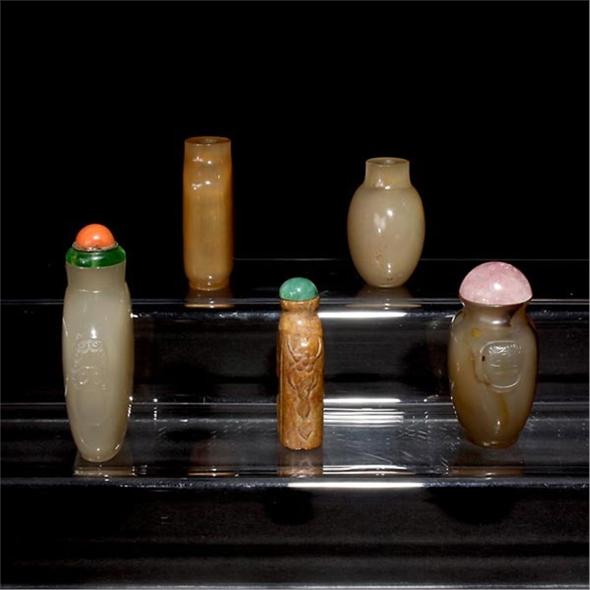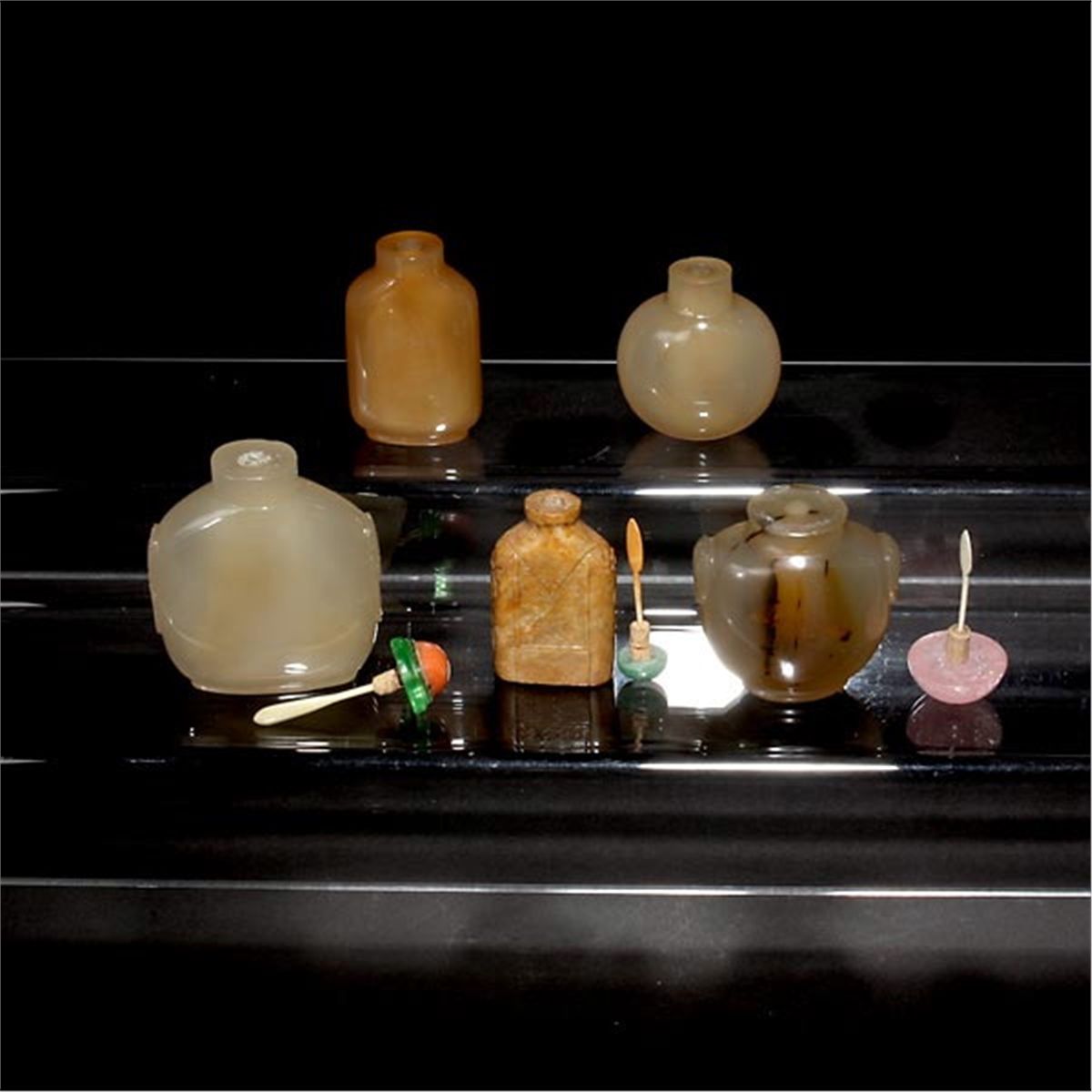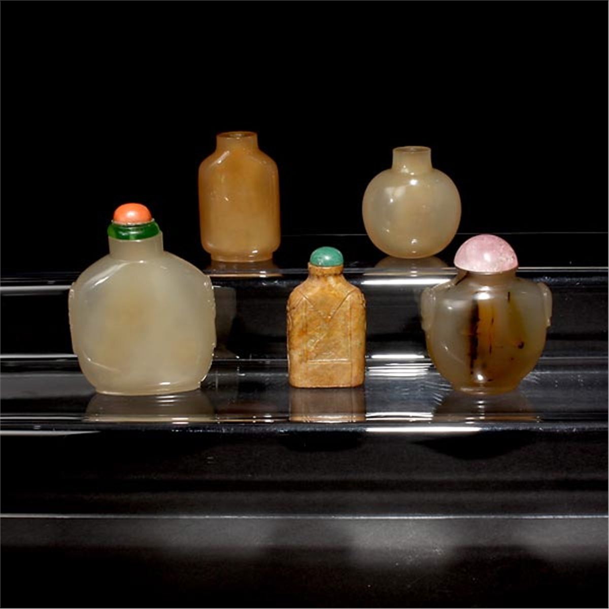 A Group of Five Stone Snuff Bottles, Including four agate bottles of various forms and one stone with carved decoration. Tallest: 3 3/8 inches (8.6 cm) [Two agate bottles lacking stopper. This condition report states major condition issues only.]