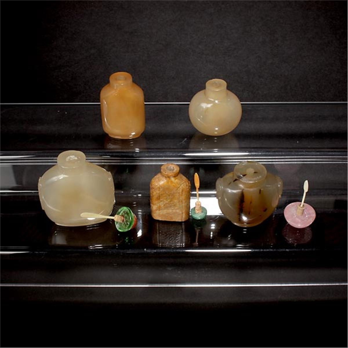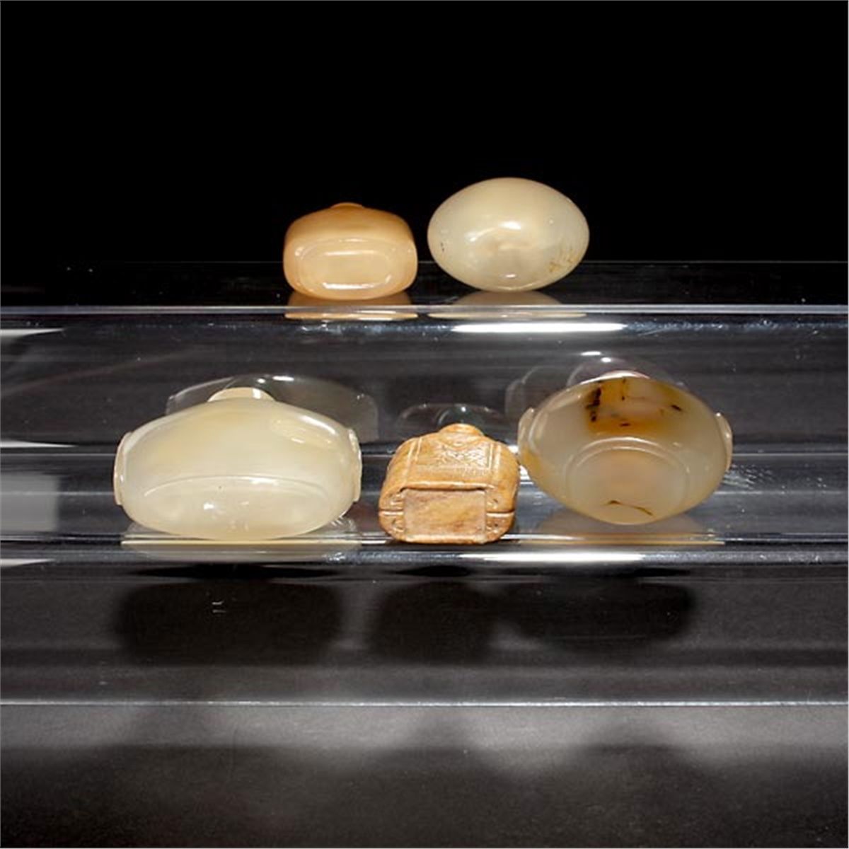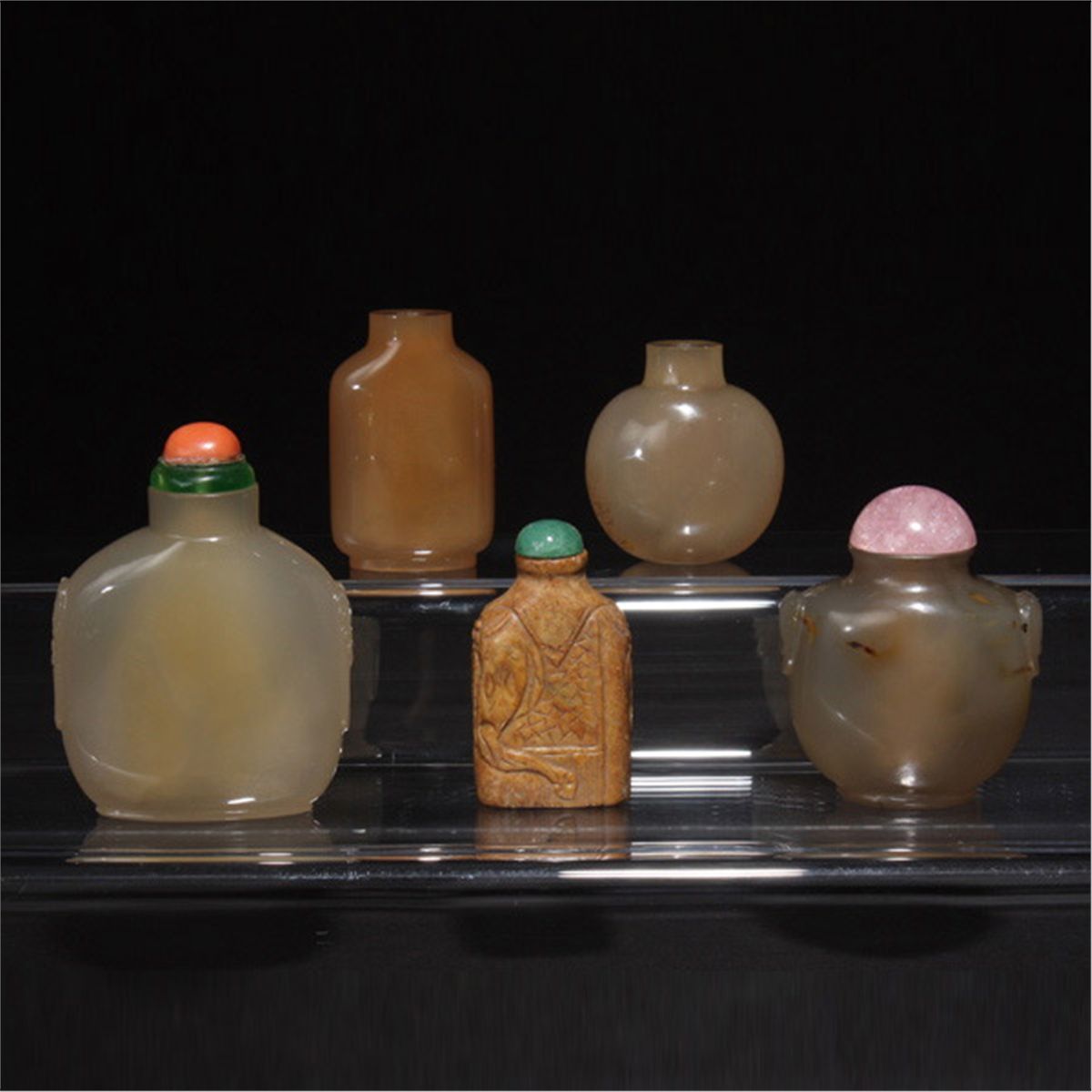 A Group of Five Stone Snuff Bottles, Including four agate bottles of various forms and one stone with carved decoration. Tallest: 3 3/8 inches (8.6 cm) [Two agate bottles lacking stopper. This condition report states major condition issues only.]