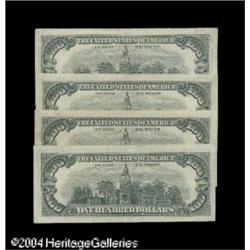 A Group of Four $100 Legal Tender Red Seals RFr. 15 <B>A Group of Four $100 Legal Tender Red Seals</B></I><BR>Fr. 1550 $100 1966 Legal Tender Notes (3) Extremely Fine<BR>Fr. 1551 $100 1966A Legal Tender Note Extremely Fine.<BR> 4 notes <BR><BR><B>Important notice:</B> Heritage usually auctions material at the rate of 200-250 lots per hour. On some occasions eBay Live bid software or the Internet may not be able to keep up with the pace of the auction. We recommend placing a realistic absentee bid now as insurance to avoid disappointment. Occasionally the auctioneer may eliminate or reject an eBay Live bid, and the auctioneer may also reopen a lot after the close of the eBay live bidding (usually because we missed an audience bid), and may reject your bid even if it shows you as the winning bidder. By bidding via eBay Live, you agree that Heritage may award the lot to another bidder at its sole discretion under the circumstances described above or any other reasonable circumstances. Since eBay bids are not shown to us until we open the lot on the floor, we treat those bids just like floor bids. In most cases the floor responds before the eBay bid is presented to us, due to Internet lag time, so for consistency we have made it a policy that floor bids are always considered first over tie eBay live bids. Also please note that all Heritage lots purchased through eBay Live carry a 20% Buyer's Premium. Please make sure you read the Terms and Conditions before you bid. This lot is being auctioned in conjunction with a live floor auction by Heritage Galleries & Auctioneers. All final auction and invoice information will be supplied by Heritage Galleries & Auctioneers, and all other information should be considered preliminary. Lot:16199