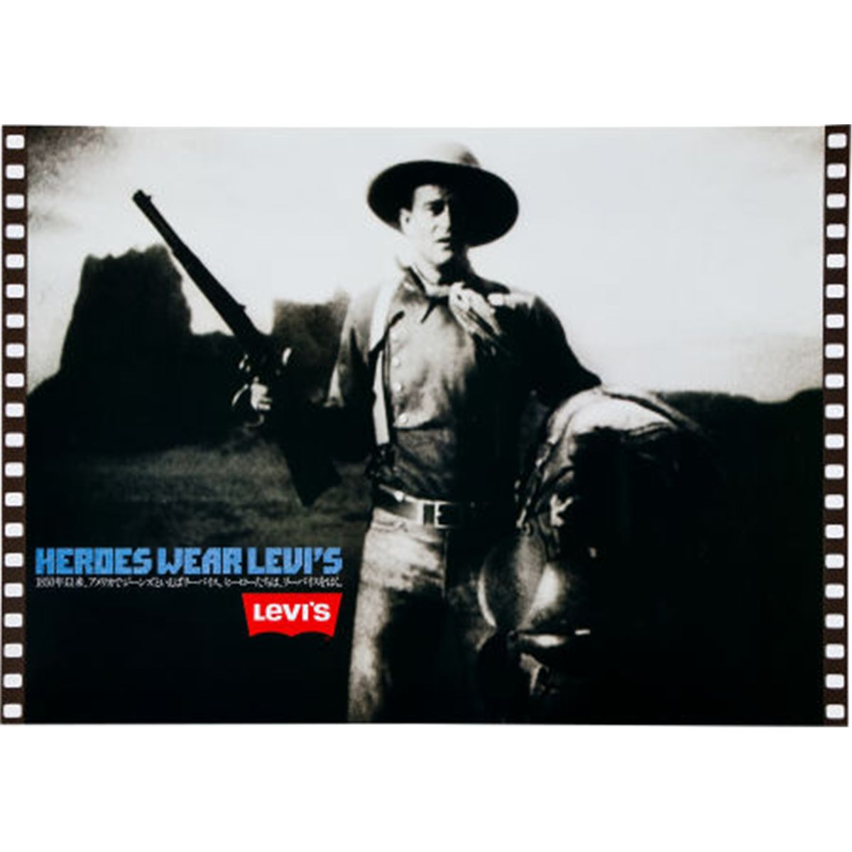 A Group of Japanese 'Levi's' Posters, 1980s. Approximately 150, all identical, featuring the famous shot from "Stagecoach" when we are first introduced to the "Ringo Kid" -- the scene that made John Wayne an instant movie star (though he had already made eighty-odd films); text on the left side reads "Heroes Wear Levi's" above Japanese characters and the Levi's logo; gifted to the Wayne Estate as they allowed his image to be used for this advertising campaign.23 1/2" x 33"
