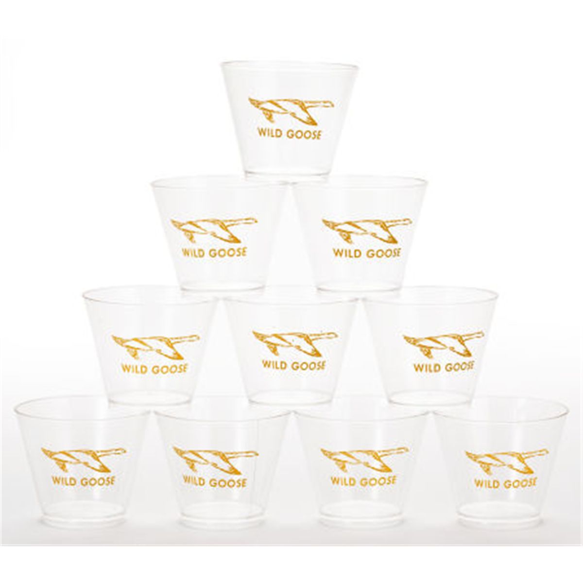 A Group of Plastic Cups from the 'Wild Goose,' 1960s. Approximately 90; printed with an image of a flying yellow goose above text reading "Wild Goose," in water and cocktail glass sizes.Height: 4 1/2" and 3"