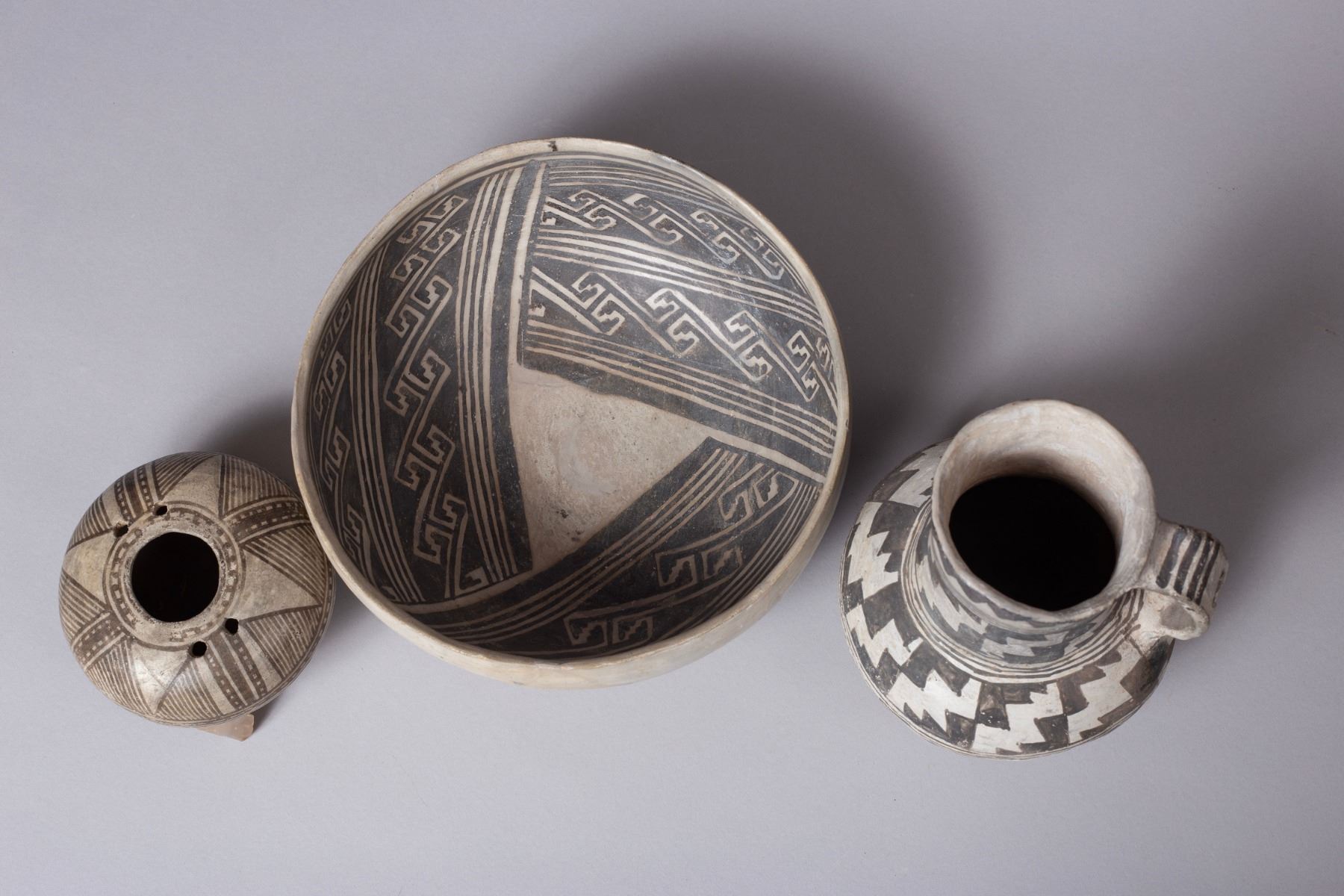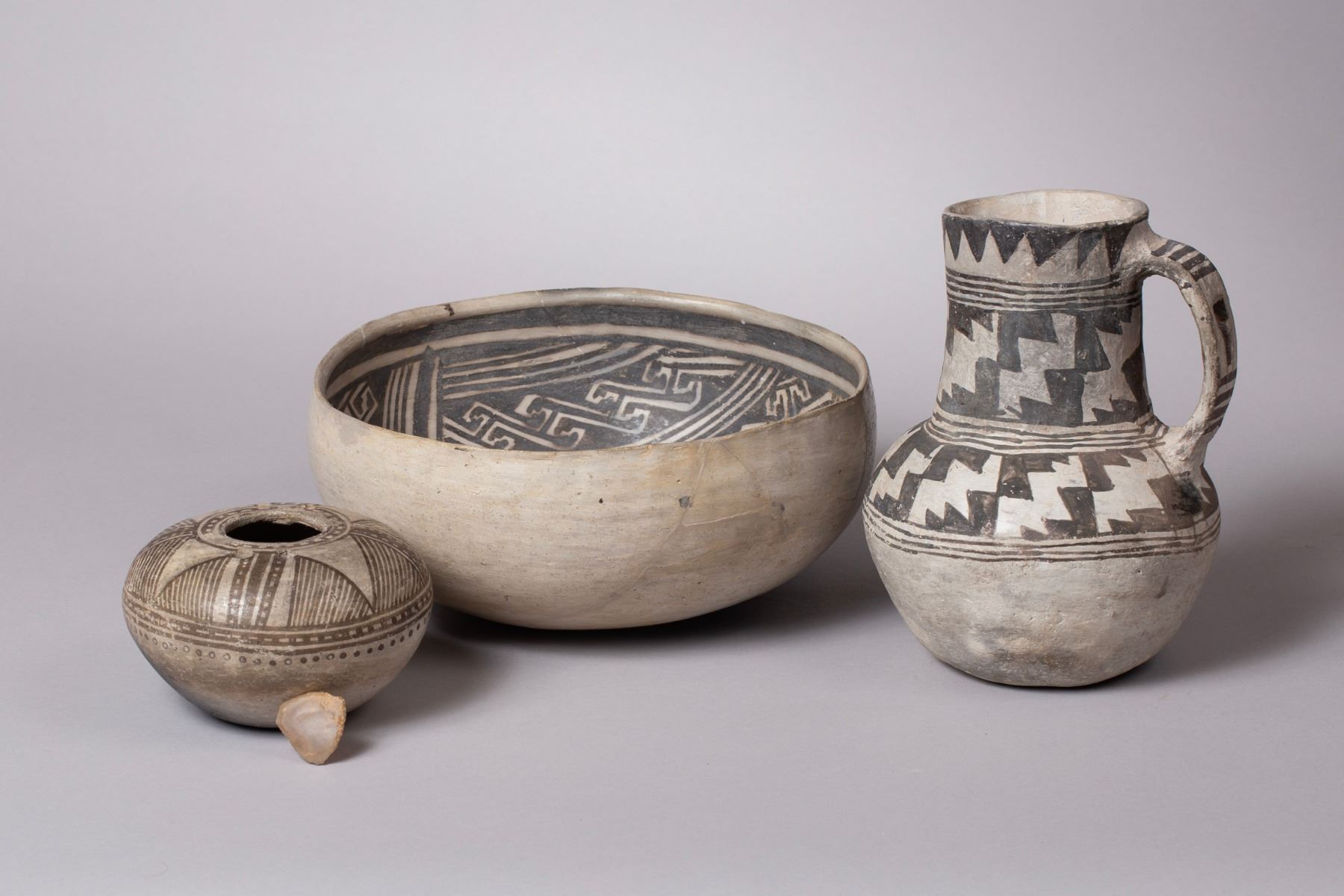 A fascinating collection of three prehistoric Ancestral Puebloan (formerly Anasazi) black-on-white pottery vessels, highlighting the Kayenta and Chaco Canyon cultural traditions. All three vessels showcase the ancient artistry of the Southwestern United States, with hand-built construction and painted geometric designs. This group offers a unique comparative study of regional pottery styles from distinct time periods and geographical areas.