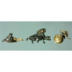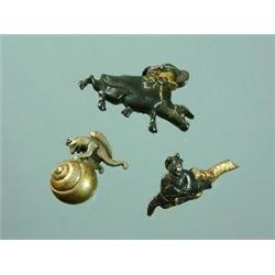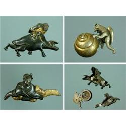 Three cast partial gilt bronze Menuki of human and animal forms in fine condition with resoldering to fittings on reverse. Japan, Edo period. 4/5"~ 1" (2.04~2.5 cm) x 1"~1 5/8" (2.63~3.9 cm)