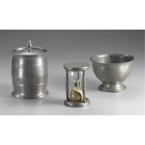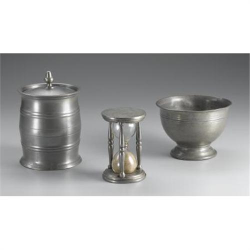 <B>A Group of Three Pewter Items<BR></B></I>Unknown makers, England and Germany<BR>Nineteenth and Early Twentieth Centuries<BR>Pewter and glass<BR>Unmarked <BR>Tobacco jar: 7.5 inches high; Bowl: 6 inch diameter<BR> <BR>Including a bowl, a covered tobacco jar and an hourglass. <B>Condition Report:</B> Normal signs of wear as appropriate with age; denting.<BR><BR><b>Shipping:</b> Hollowware/Pottery/Glass, Large (<a target="_blank" href="http://www.heritageauctions.com/common/shipping.php">view shipping information</a>)