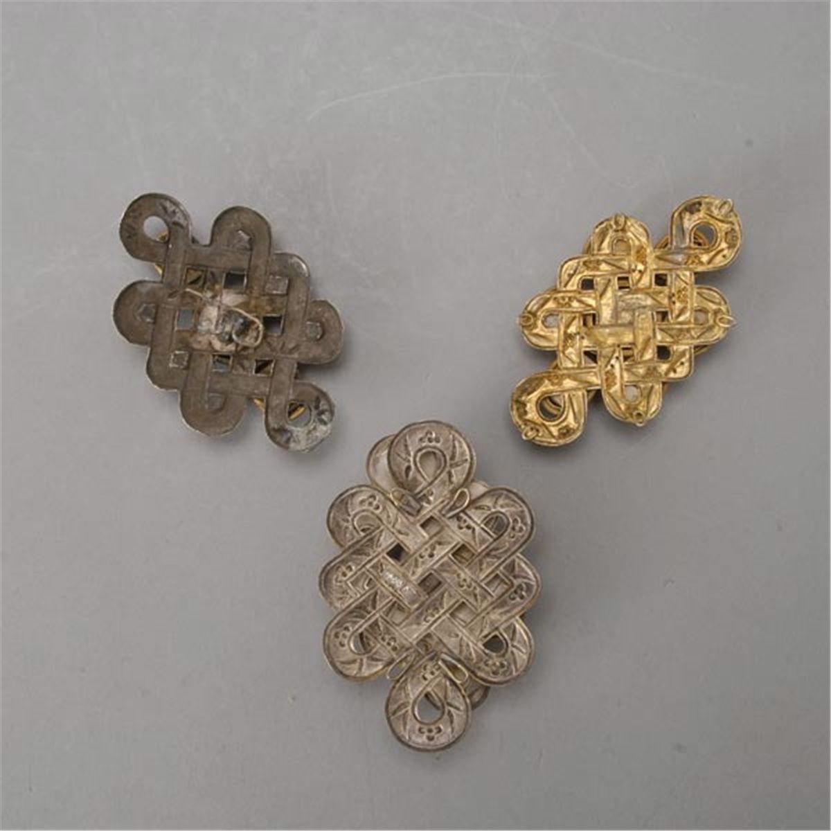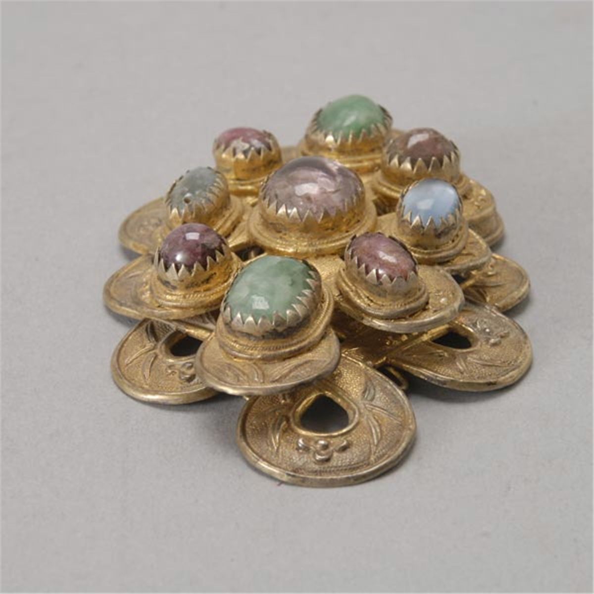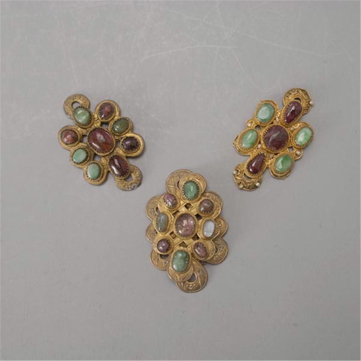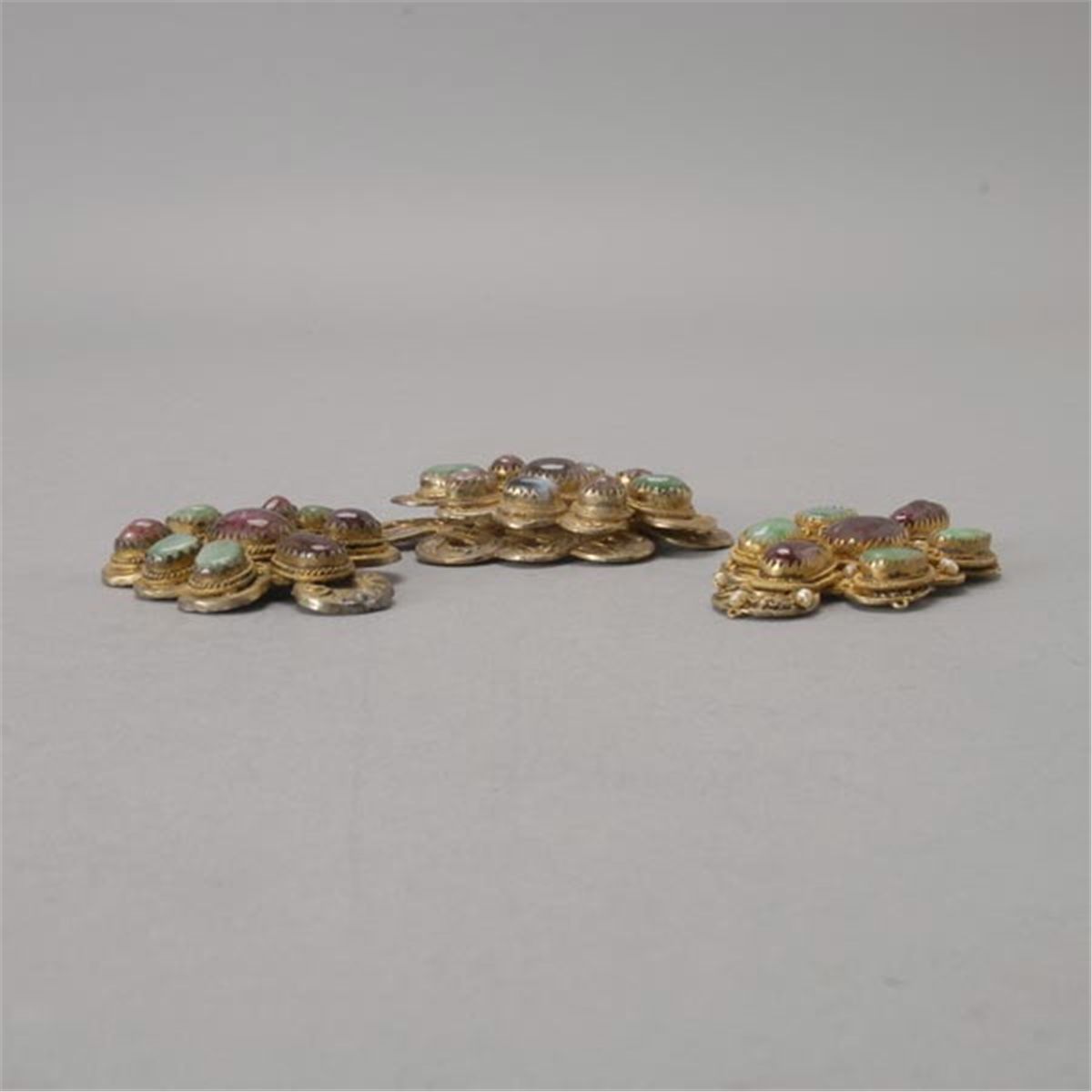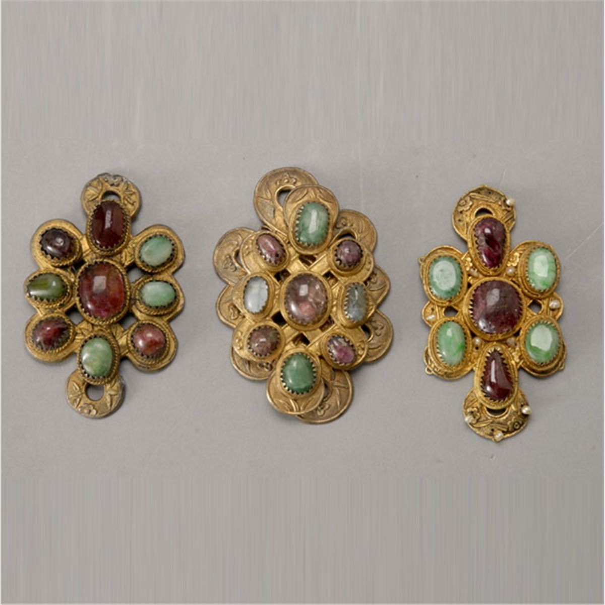 A Group of Three Precious Stone and Metal Ornaments, The first of jadeite, glass and sapphire; the second of sapphire, aquamarine and jadeite; the third of sapphire, jadeite and cultured pearl, all set in a gilt-metal mounts. Average Length: 3 3/8 inches (8.6 cm) [Wear, soiling. This condition report states major condition issues only.]