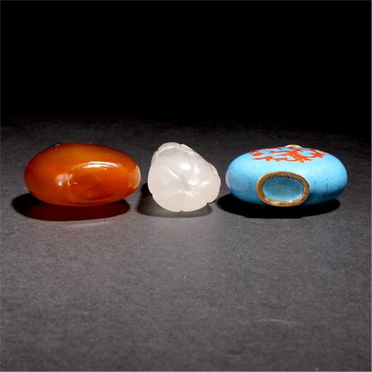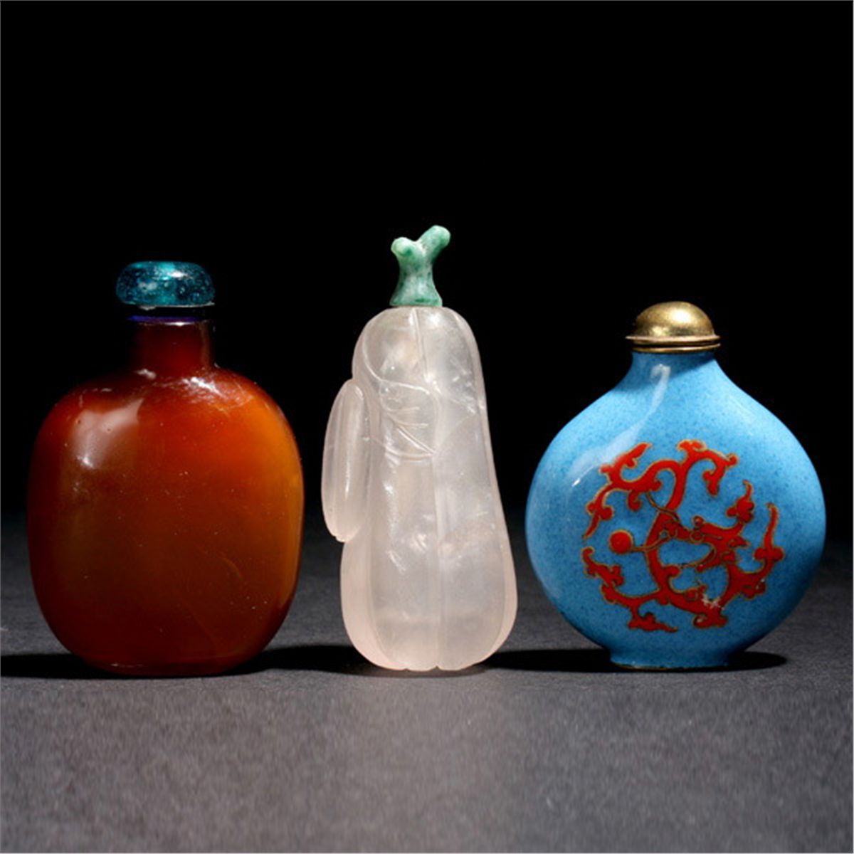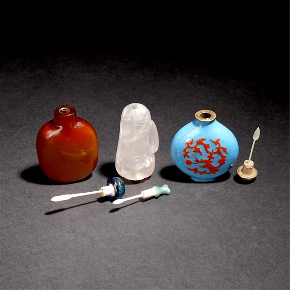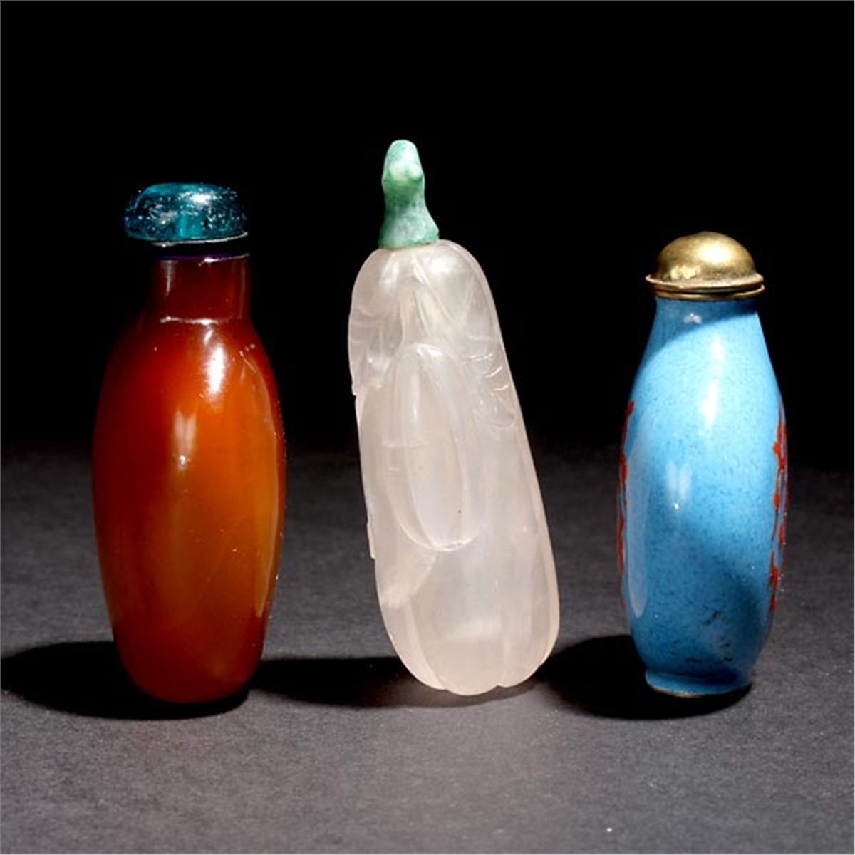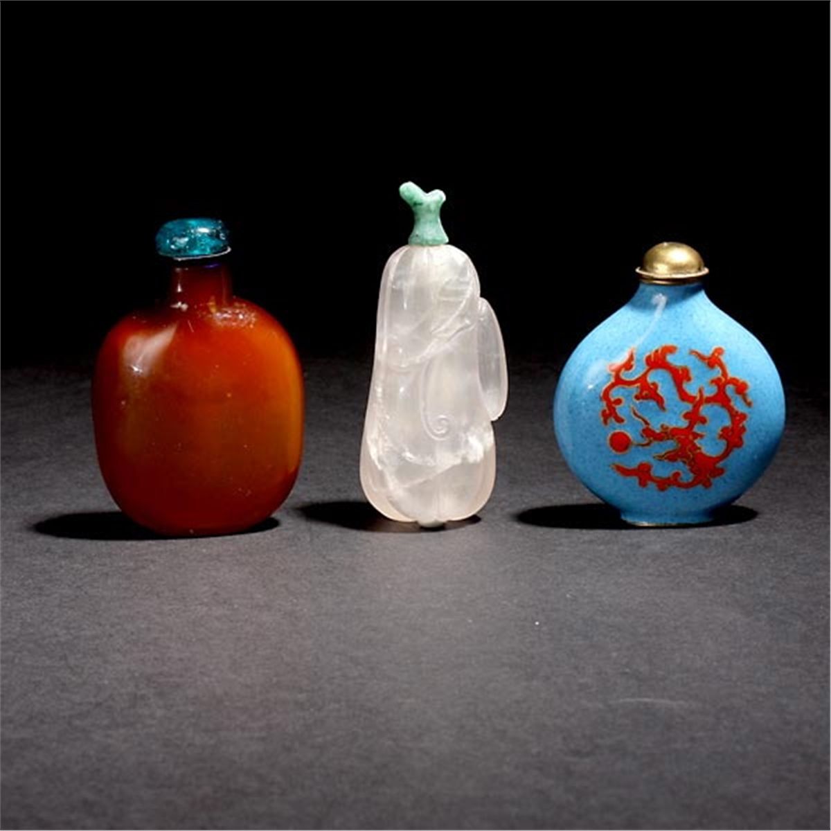 A Group of Three Snuff Bottles, The first of rock crystal, carved a gourd, with stone stopper; the second of agate with a glass stopper; the third of painted enamel with painted dragons to the front and the reverse, with a gilt-painted metal stopper. Tallest: 3 inches (7.6 cm) [Minor chips. This condition report states major condition issues only.]