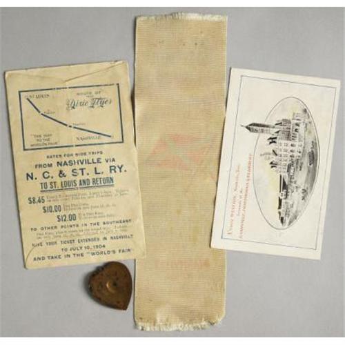 <B>A GROUPING OF CONFEDERATE REUNION ITEMS.</B></I> Confederate Surgeon Samuel Caldwell collected medals and ribbons and pamphlets from reunions of the United Confederate Veterans after the war. In this grouping there are a silk ribbon from the 1897 Nashville UCV reunion, two souvenir pamphlets from the 1904 Nashville reunion and a beautiful heart-shaped brass charm bearing the likeness of Winnie Davis from the 1904 Nashville reunion.<BR><BR><B>Provenance:</B></I> CSA Surgeon Samuel Caldwell, Forrest's Cavalry<BR><B><BR>Condition</B></I>: The brass charm has a dark patina, the paper and silk items are in good condition.<BR><BR><b>Shipping:</b> Miscellaneous Collectibles, Smal (<a target="_blank" href="http://www.heritageauctions.com/common/shipping.php">view shipping information</a>)