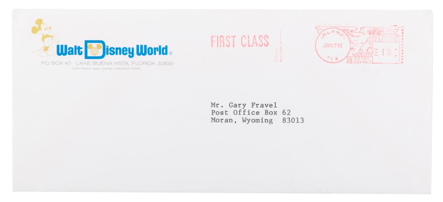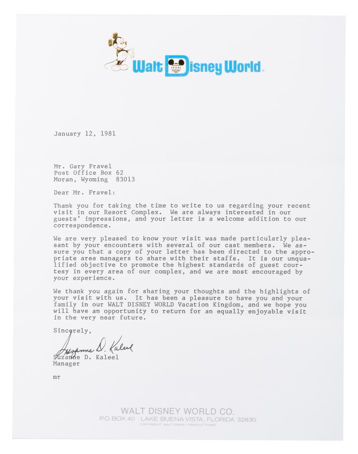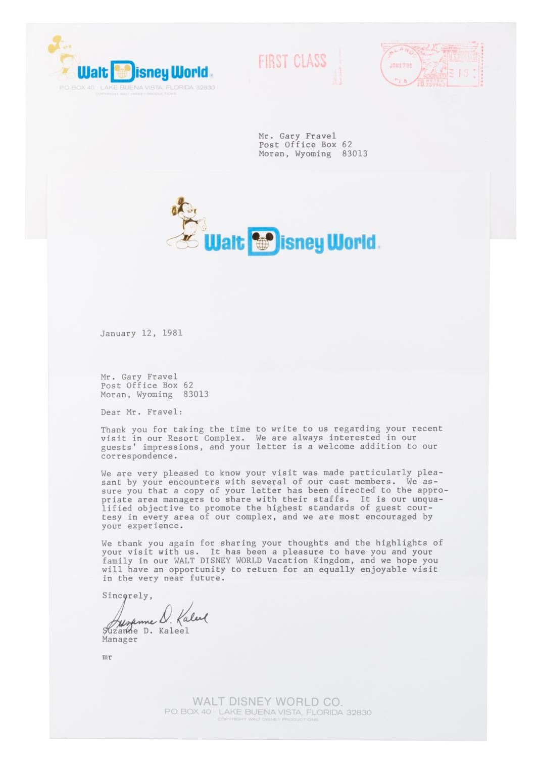 (Walt Disney World Resort, 1981) A thank you letter sent from Walt Disney World Resort to a Guest who submitted feedback about their stay. Measuring 4.25" x 9.5" in the original Walt Disney World envelope, the letter is in fine condition.