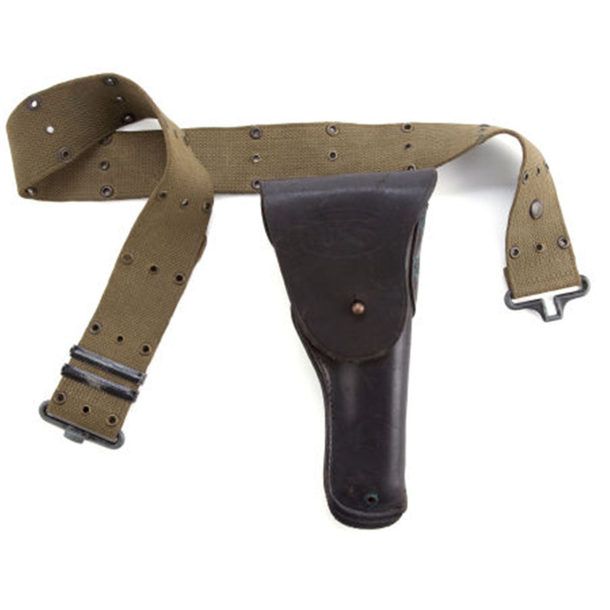 A Gun Holster, 1960s-1970s. Made of black leather, with a "US" stamp on side flap, back embossed "Boyt 43," attached to a canvas belt; possibly used in a film.10" x 5"