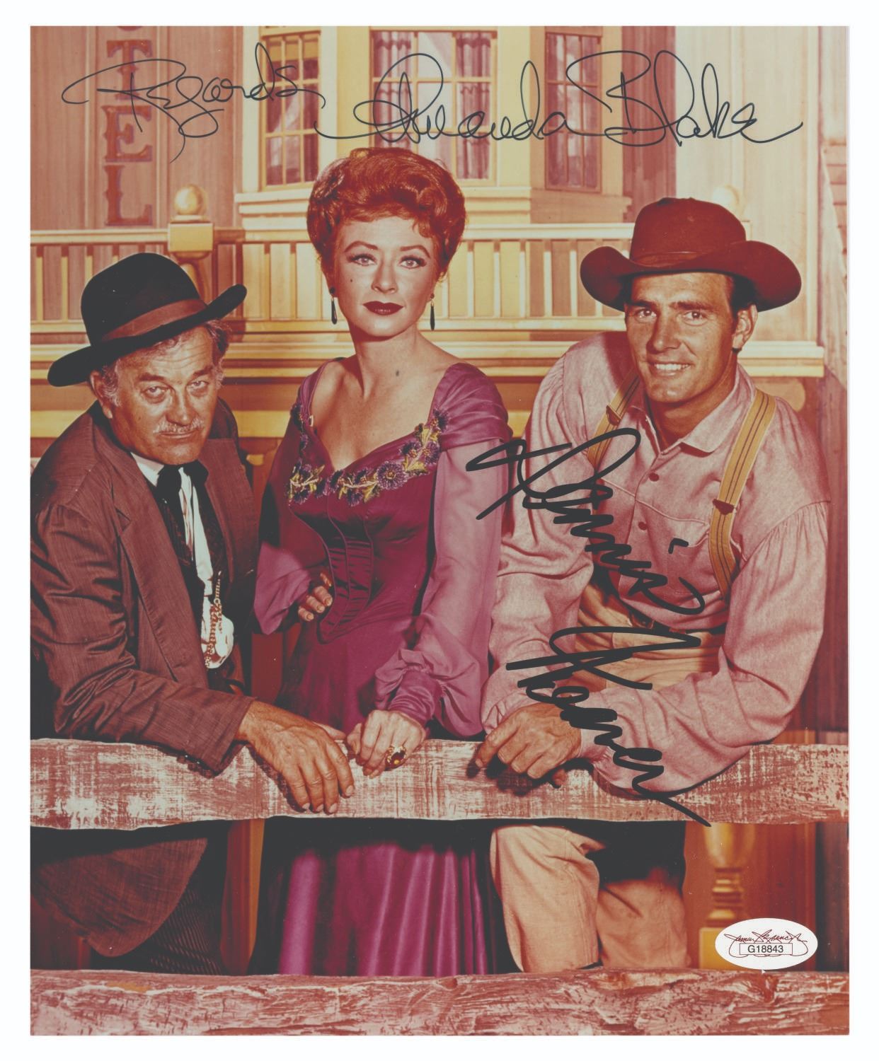(CBS, 1980s) A multi-signed "Gunsmoke" publicity photo featuring signatures from Amanda Blake and Dennis Weaver. Measuring 8" x 10", the photo is in very good condition with an adhesive authenticity label in the lower right corner.
