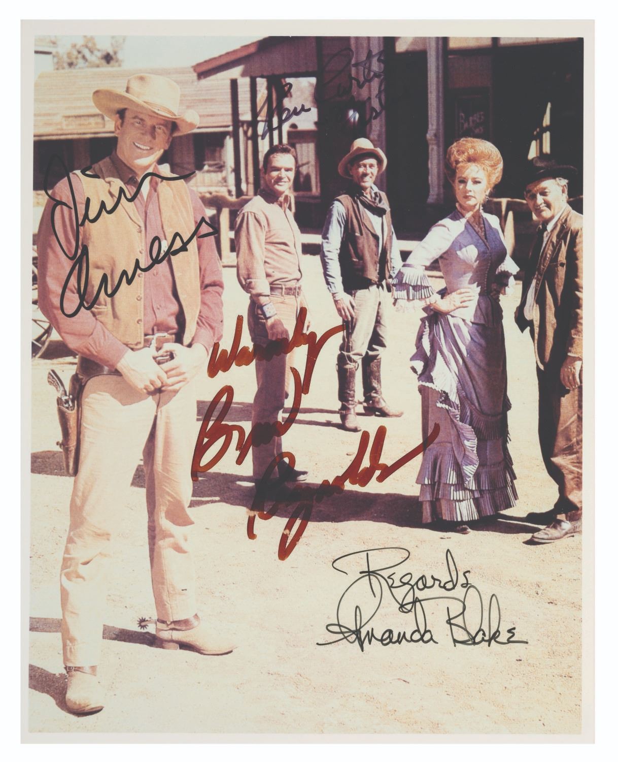 (CBS, 1980s) A "Gunsmoke" publicity photo signed by Amanda Blake, Burt Reynolds, James Arness, and Ken Curtis. Measuring 8" x 10", the photo is in very good condition with an adhesive authenticity label on the reverse.