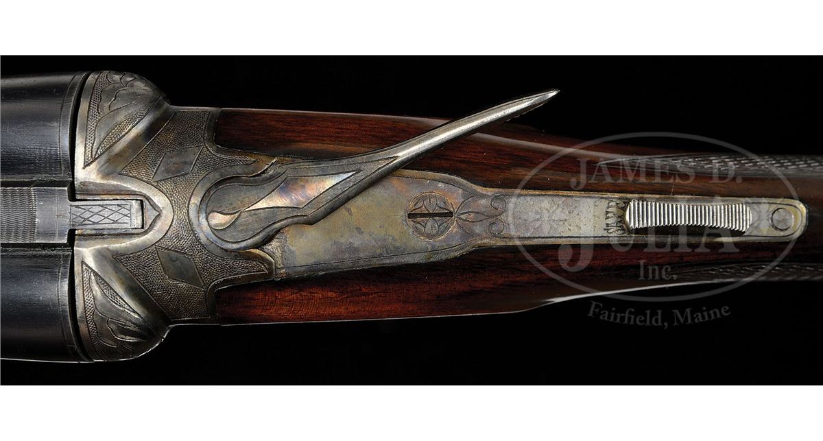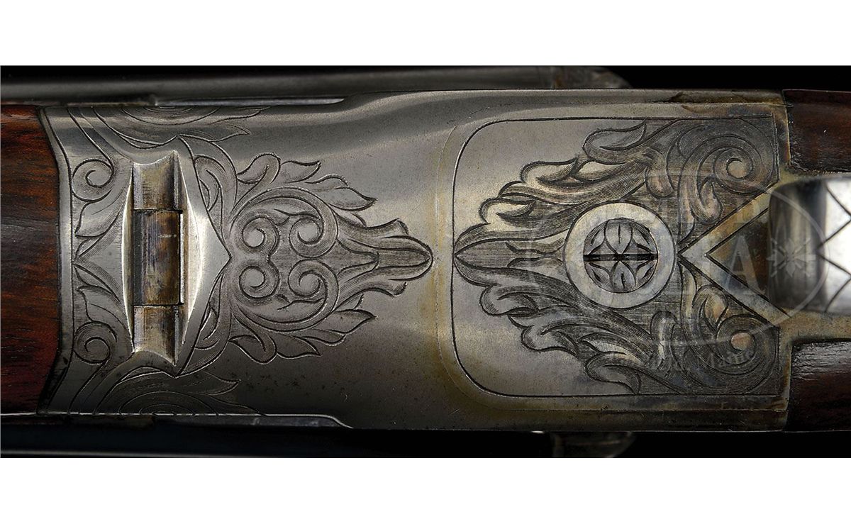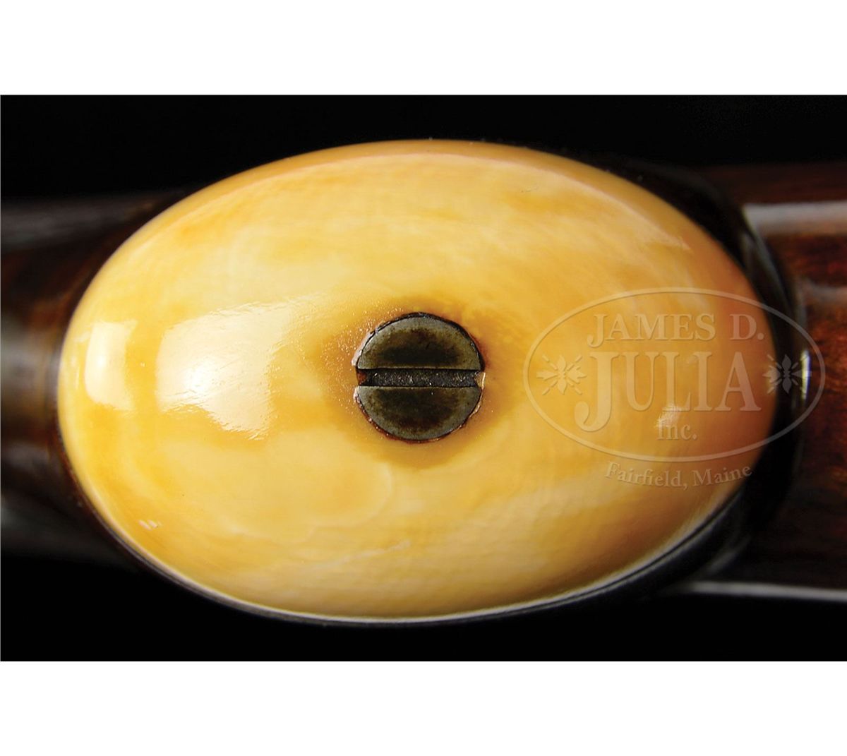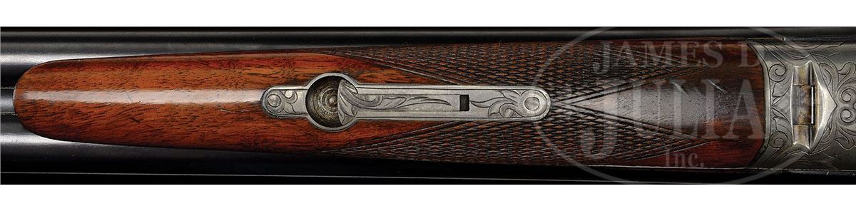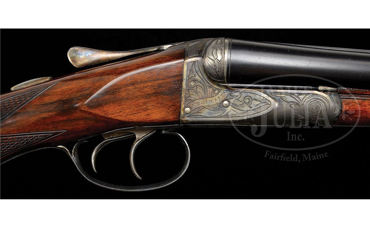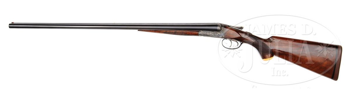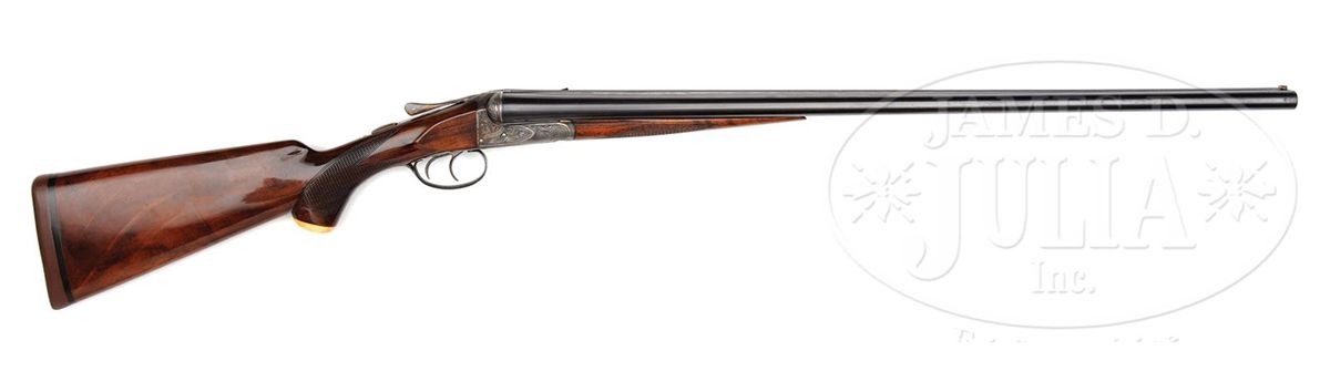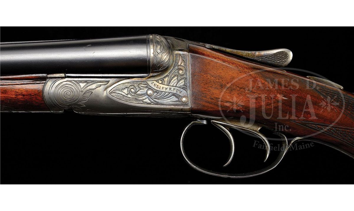 SN 202815. Cal. 20 ga. 2-3/4" Chambers. 28" Bbls with narrow, concave, matted rib mounted with ivory mid and Bradley red front, beads, are marked for Chromox steel and Fox, Philadelphia address, on tops. Typical case hardened small "A" engraved action features automatic safety and chrome plated double triggers. Lightly marbled European walnut checkered pistol grip buttstock measures 14-7/8" over brown NOSHOC pad, and is fitted with rounded ivory grip cap. Matching splinter forend has Deeley type release. Bore diameter: left-.613, right -.614. Bore restrictions: left -.017 (Full), right -.005 (IC). Wall thickness: left -.036, right -.032. Drop at heel: 3", drop at comb: 1-11/16". Weight: 6 lbs. 10 oz. LOP: 14-7/8". CONDITION: Very fine. Bbls retain over 90% orig blue with some light flecking. Mid bead has been moved forward and hole plugged with slotted screw. Action retains 60 - 70% orig case hardening color. Trigger guard retains most of its bright blue, silvering at grip. Stocks have been refinished and retain nearly all of that finish. Pad is new. Ivory cap appears to have been in place for a long time. Checkering is lightly re-cut. Bores are excellent. Action is tight. 4-49687 MGM299
