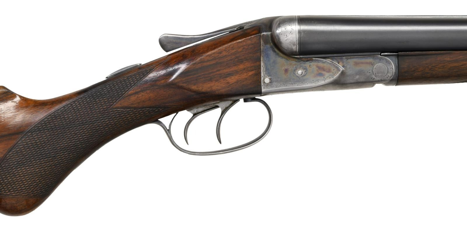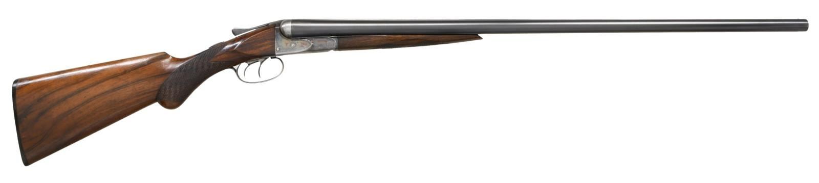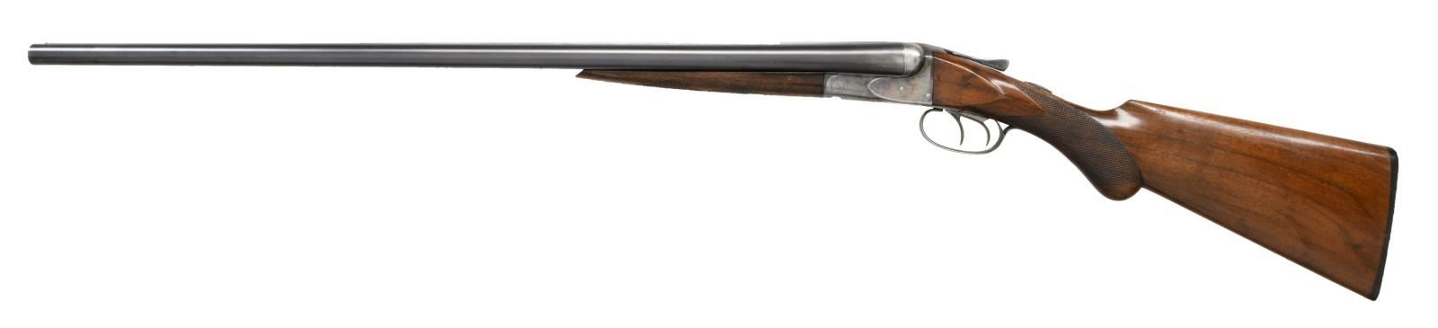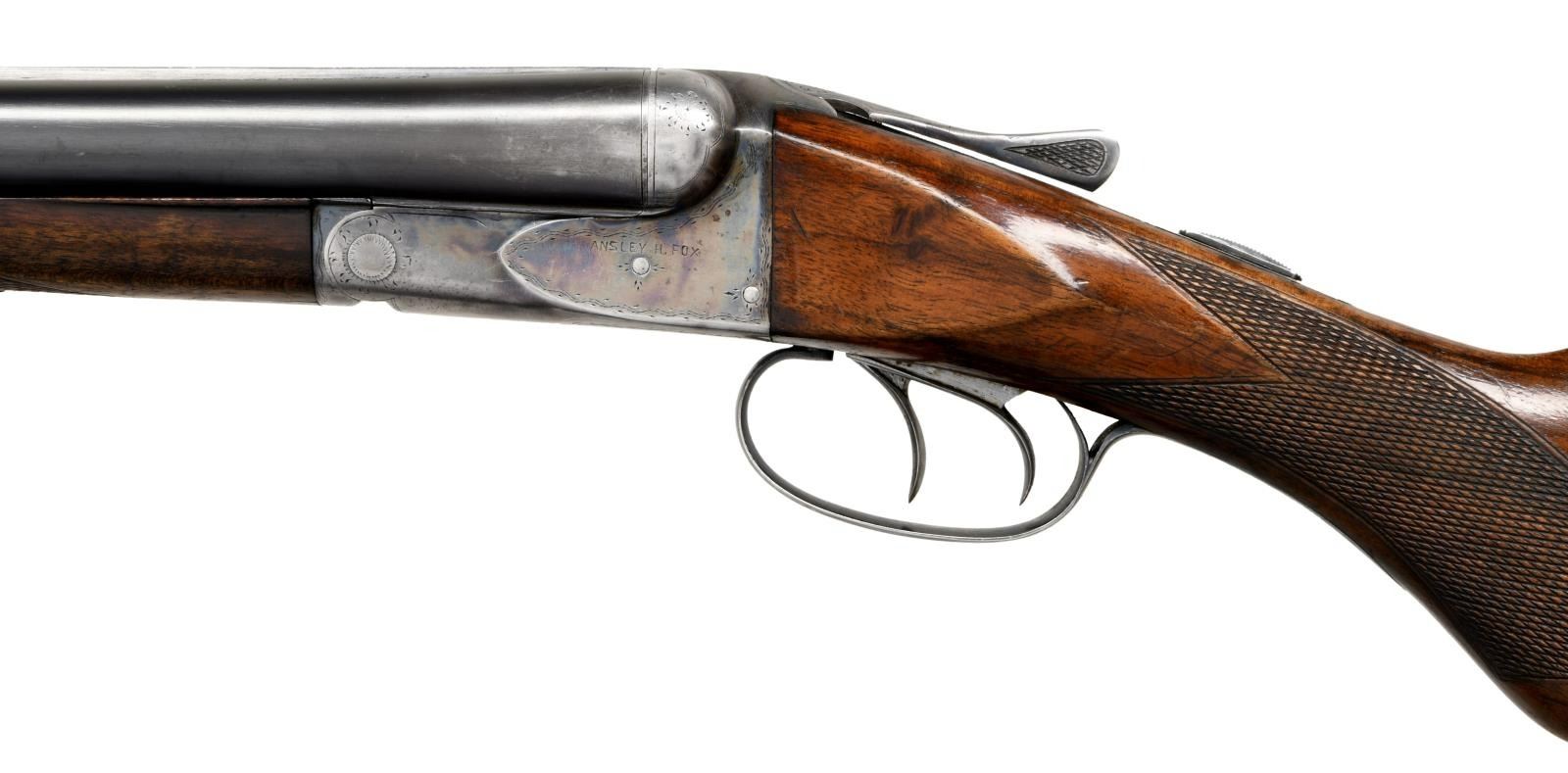Cal. 16 ga. 2 9/16". S# 300196. One would be hard pressed to find an early AE grade Fox in this condition. Bbls. 28" of Krupp Fluid Steel. Case colored boxlock action w/ early style fine engraving. Double triggers. Selective ejectors. Splinter forend & round knob pistol grip stock of checkered walnut. LOP: 14" over original buttplate. DAC: 1 7/8". DAH: 3 3/8". Neutral cast. Bore diameter: R, .659", L, .659". Choke constriction: R, .030", L, .035". Minimum wall thickness: R, .038", L, .040". WEIGHT: 6 lbs, 5.2 ozs. Mfg. 1913. CONDITION: 90% lightly faded bbl. blue. Action retains 60% lightly faded case colors showing wear in carry areas. Wood shows finish & checkering wear w/ numerous scratches & marks. Very good bright bores. (23-4805/DS). CURIO. $3500-5000.