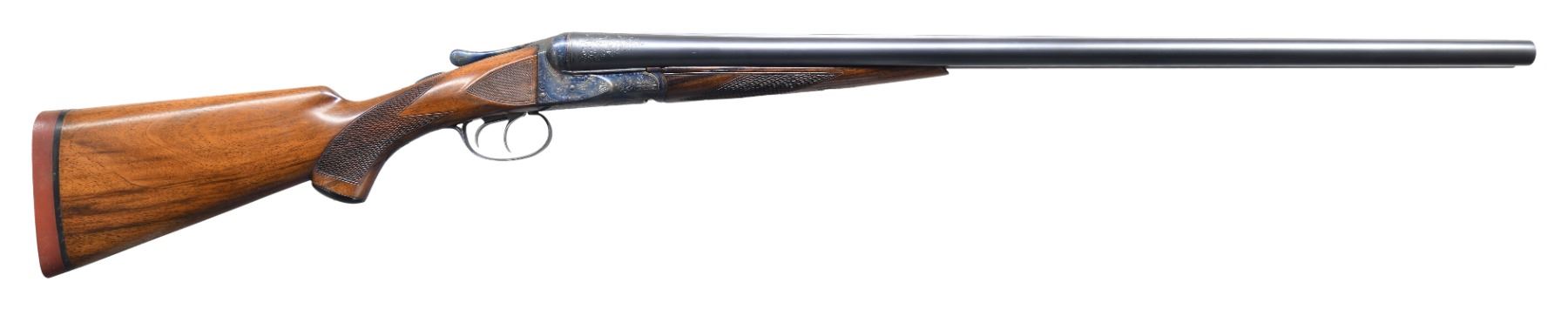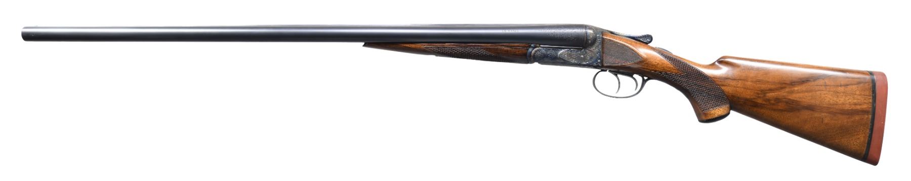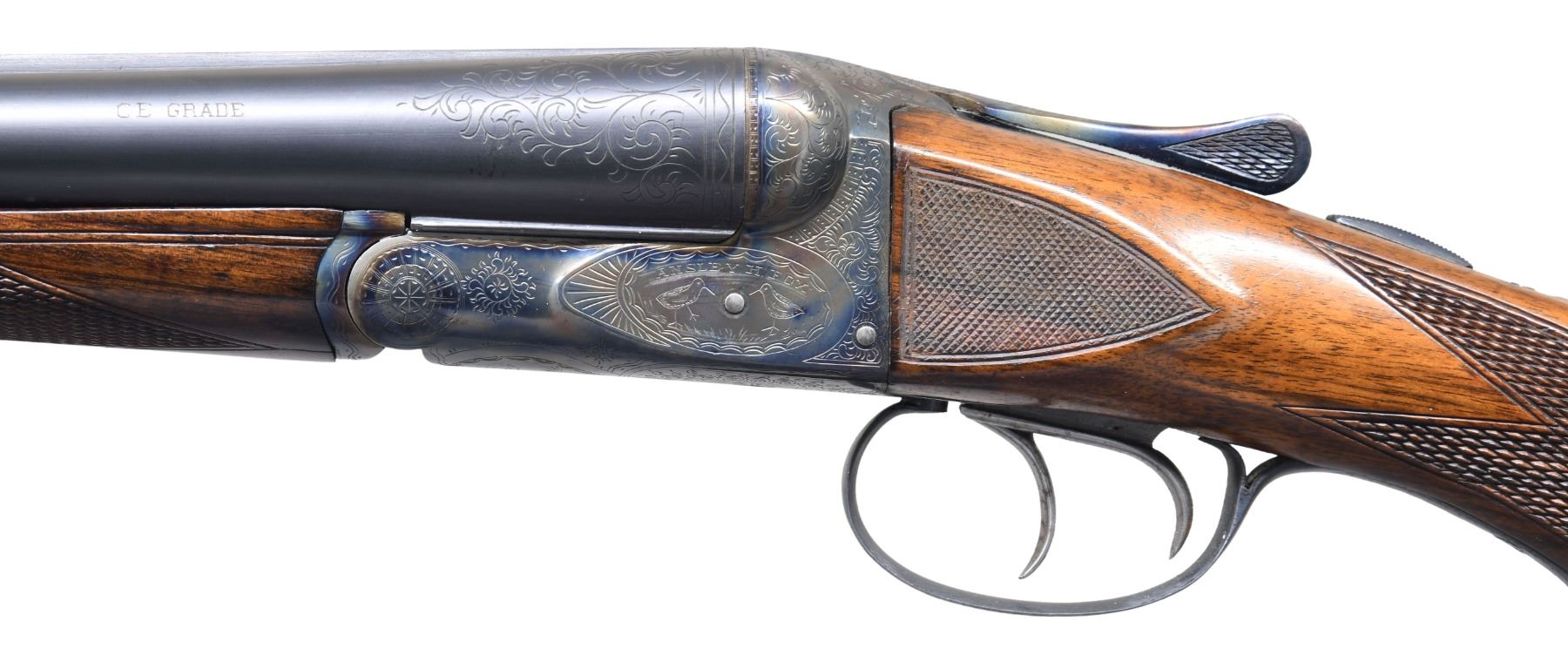 Please note as of 4/29/25 this item description has been updated. Please revisit this description and contact us with any questions. Cal. 12 Ga., 2 3/4". S# 33122A. Bbls. 28" with concave matted solid rib & steel front bead, choked IM & Mod. Case colored boxlock action features added fine scroll engraving with game bird vignettes on left and right plus pointing dog on bottom. Chambers of bbls decorated with matching fin scroll with straight and wavy borders at breech. Left bbl. marked on side "CE GRADE". Checkered walnut capped pistol grip stock & splinter forend. Stock ears have added checkering. Ejectors. Double triggers. Philadelphia Mfg. LOP: 14 1/4" over Old English pad. CONDITION: all finishes very good to near excellent as refurbished at time of upgrade. Bright shiny bores. Trigger pulls are a little strong. Ejectors are out of time. (25-1401/BH) CURIO. $1,200-1,800.