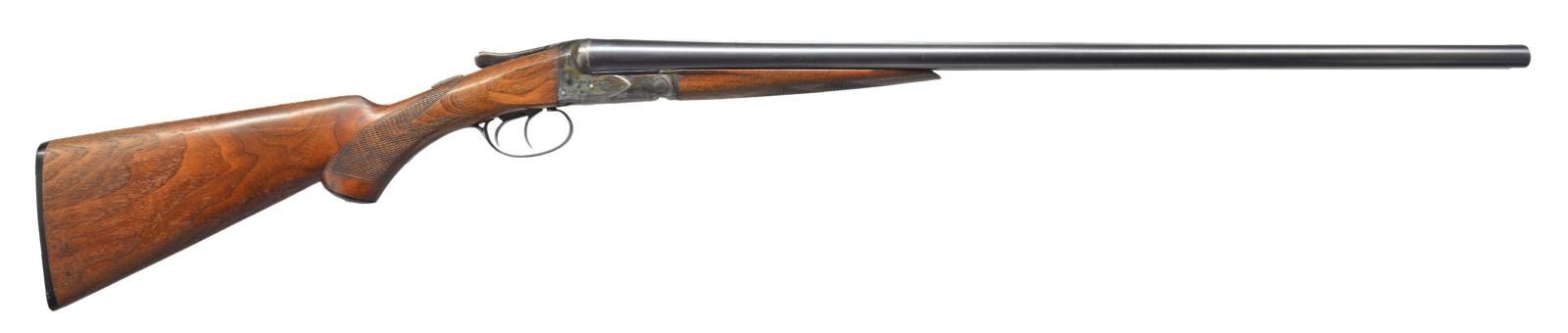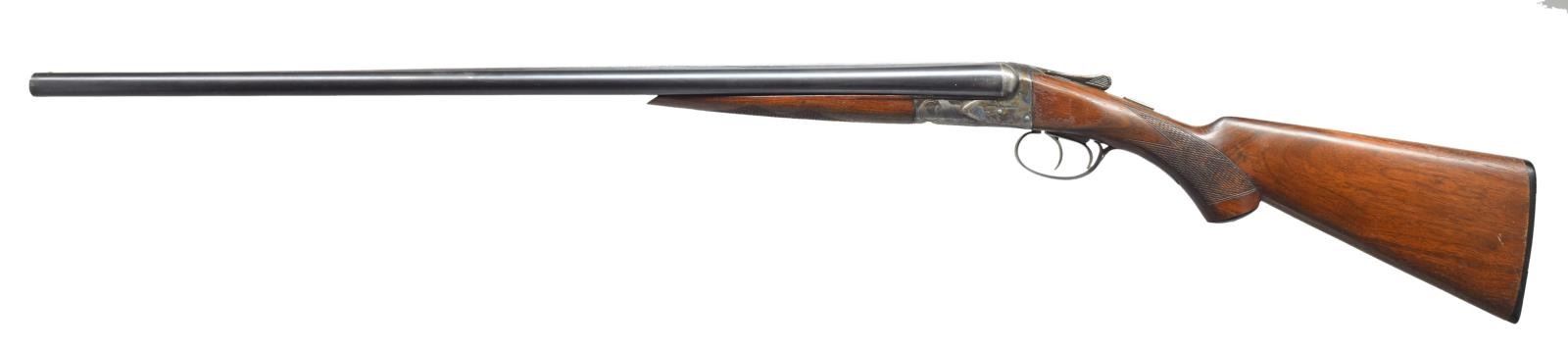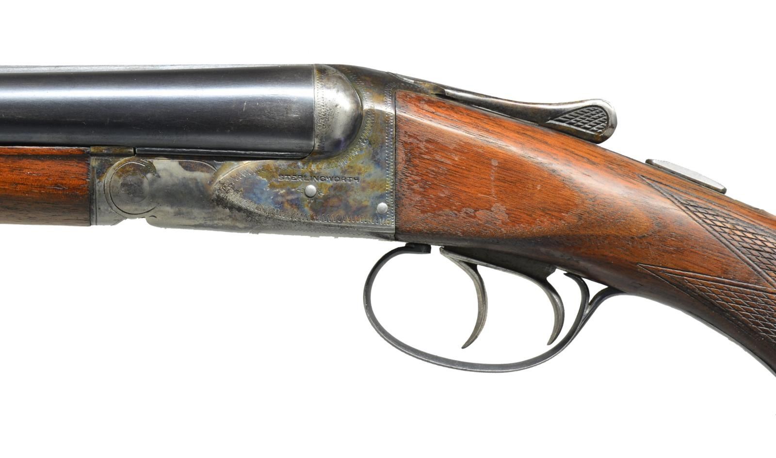 Cal. 16 Ga., 2 9/16". S# 365531. Bbls. 28" of Sterlingworth Fluid Compressed steel w/ steel front bead. Fixed Mod. & Full chokes. Case colored boxlock action w/ rotary bolt locking & borderline engraving. Dbl. triggers, extractors. Splinter forearm & hard rubber capped pistol grip walnut stock w/ hand checkering. LOP: 14 1/8" over original buttplate. DAC: 1 3/4". DAH: 3 1/8". Neutral cast. WEIGHT: 6 lbs., 3 oz. 1929 Mfg. CONDITION: bbls. retain 95% lightly worn blue. Action retains 75% case colors w/ wear in carry areas. Original wood finish shows wear & peeling w/ scattered scratches & marks. Stock has sm. crack along right side of action. Good bright bores. (21-325/DS). CURIO. $2,000-2,500.