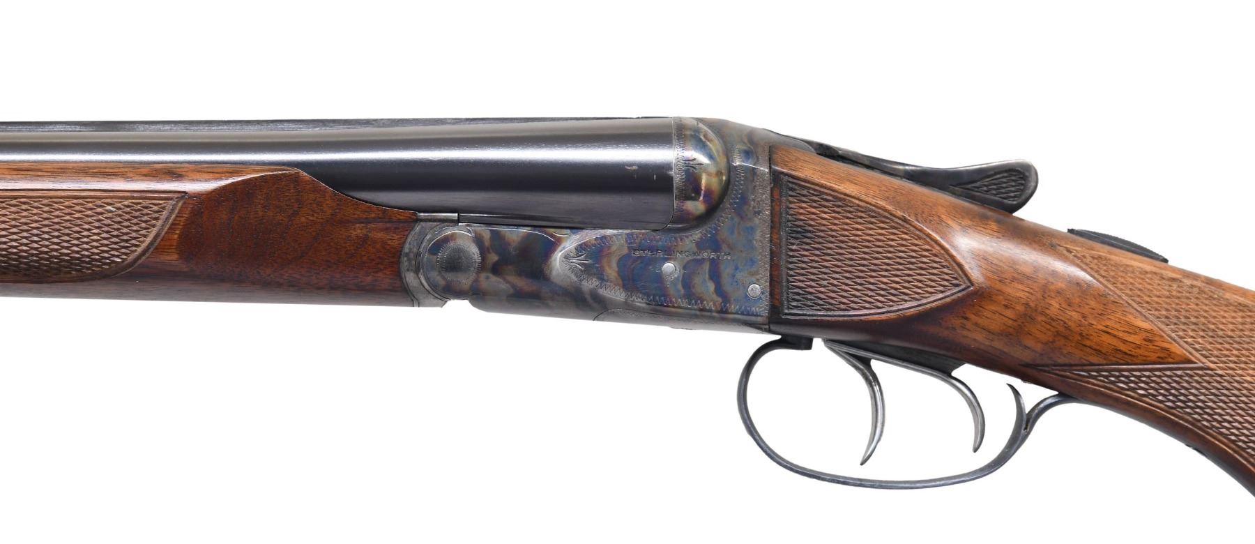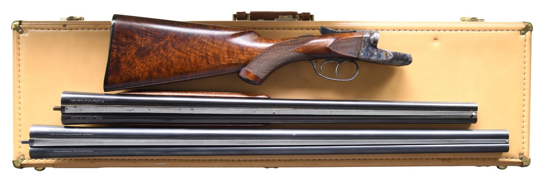 Cals. 16 & 20 ga. S# 360245. Bbls.1: 16 ga. 2 3/4". Original 30" A.H. Fox marked of Sterlingworth Fluid Compressed Steel w/ splinter forearm. Fixed Mod & full choke w/ steel front bead. Bbls.2: 20 ga. 2 3/4". Added 26" Savage Arms Corporation marked w/ beavertail forearm. Fixed IC & Mod chokes w/ white front & mid beads. Added bbls. & forearm iron are properly numbered to the gun. Case colored boxlock action w/ borderline engraving. Double triggers. Extractors. Replacement hard rubber capped pistol grip stock of fancy walnut having additional checkering on stock ears. LOP: 13 15/16" over hard rubber buttplate. DAC: 1 5/8". DAH: 2 5/16". Stock has a slight cast on. WEIGHT: w/ 30" barrels 6 lbs, 9.6 oz. Mfg. 1926. UNATTACHED ACCESSORIES: Winchester Model 23 yellow vinyl covered case. CONDITION: very nice two ga. set. 16 ga. bbls. retain over 95% lightly faded blue showing small spots of wear & corrosion. 20 ga. bbls. retain over 98% blue showing small wear spots & handling marks. All bores are near excellent. Action retains 90% case colors w/ areas of light pitting on right side adjacent to the stock & on the top tang. Stock & both forearms have very good finish w/ sharp checkering. Stock has a small chip & hairline crack behind the top tang. Action is tight & on face. (25-768/DS). MODERN. $2,000-2,900.