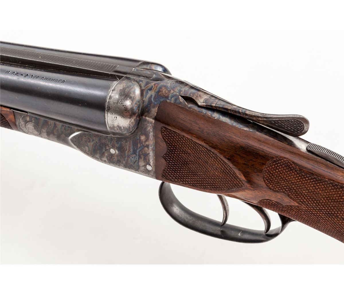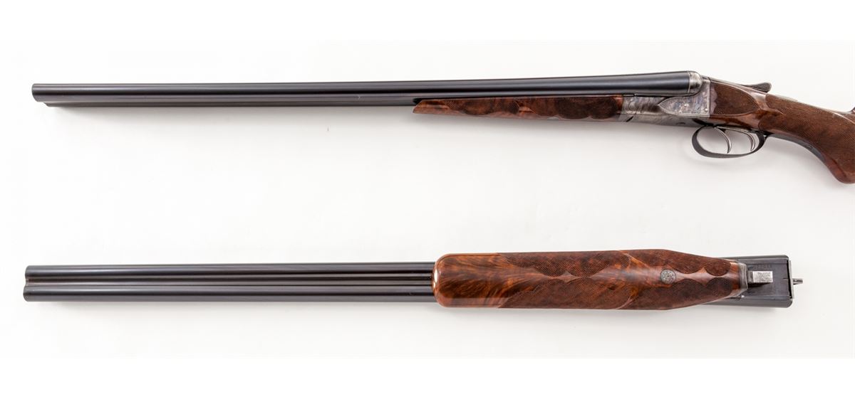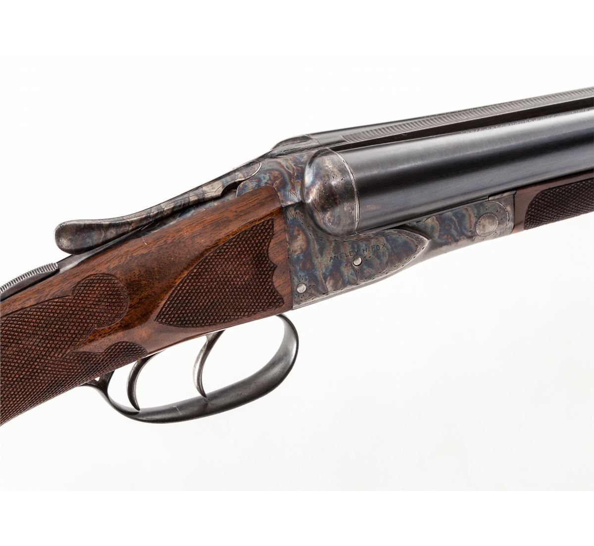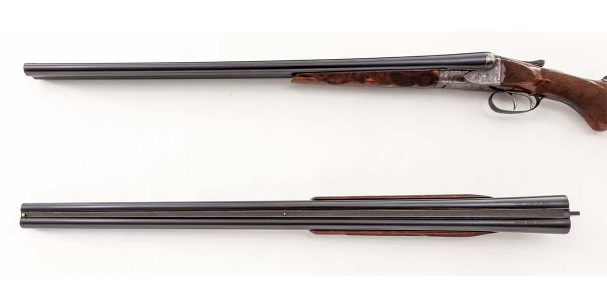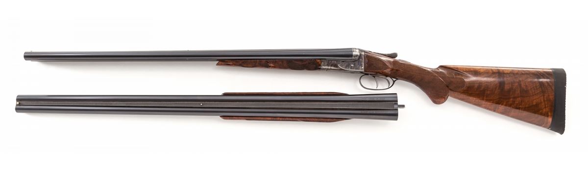 A.H. Fox ''A'' Grade Custom Side-by-Side Shotgun with Two Sets of Barrels, #300011, 16 ga., 2-3/4'' chs., 26'' original A.H. Fox barrels stamped #1 with over-stamped proof by Savage, later 30'' Savage/Fox barrels stamped #2. Both barrel sets are blue finish with concave matted ribs, front and middle white beads, Full/Mod. Chokes, and serial numbered to match the frame; double triggers (rear trigger not working), ejectors and manual sliding top tang safety; case-colored frame assembly and forend iron are engraved with fine border highlights typical of early-style ''A'' grade engraving patterns; restocked with gloss-finish, highly figured American walnut having a round knob grip and deluxe checkered in a broad coverage eliptical style with checkered side panels; the 26'' barrels have a splinter forend and the 30'' barrels have a beavertail forend, both forends are numbered to the barrels. Length of pull is 13-3/4'' over a 7/8'' solid black Pachmayr recoil pad, weight with the 26'' barrels is 6 lbs. 3 ozs. Originally mfg'd ca. 1919. Overall exterior condition remains fine with 98% thin refinish blue on barrels and 75% bright recoloring on frame and forend irons; the 26'' barrels have two linear scratches and marring on the left barrel between the forend tip and the address. Stock finish is better than 98% with a few handling marks and small edge chipping along the lower tang. Barrels are tight on the face, bores are bright, action is generally good with repairs required to the rear trigger, left striker and cocking lever; frame and tang screws would benefit from refitting. Est.: $1,500-$2,500. (C&R)