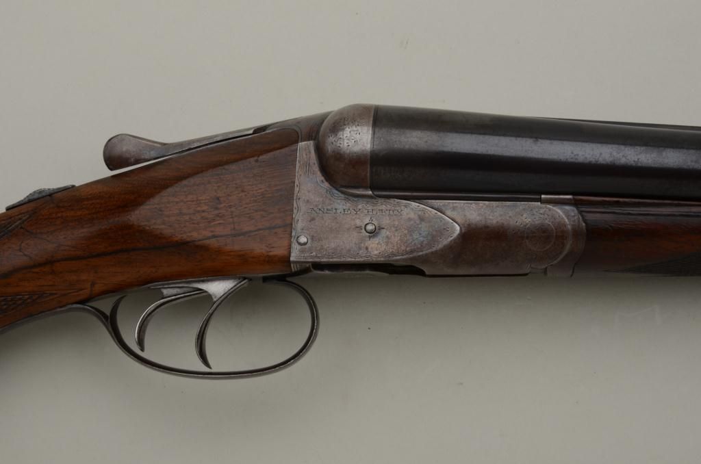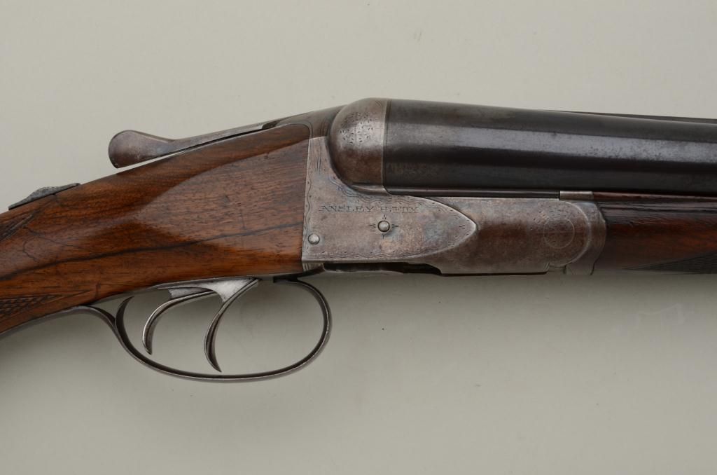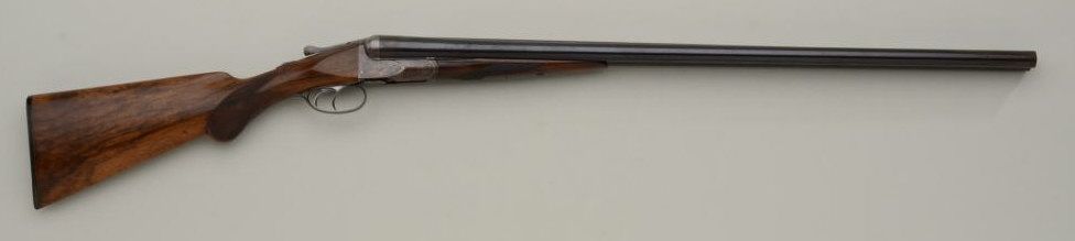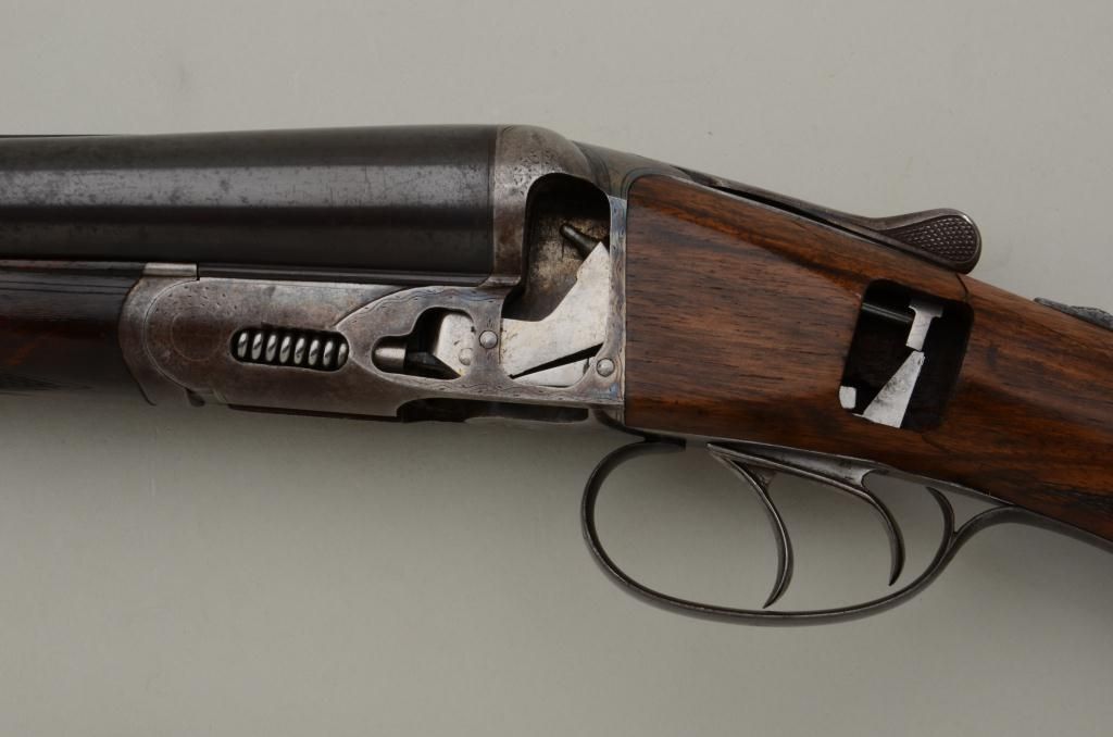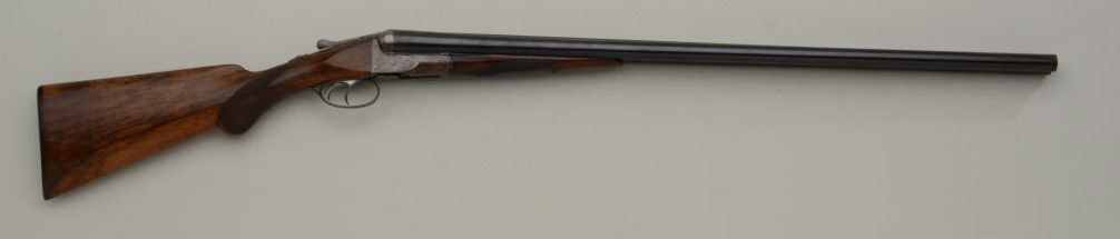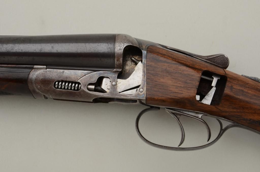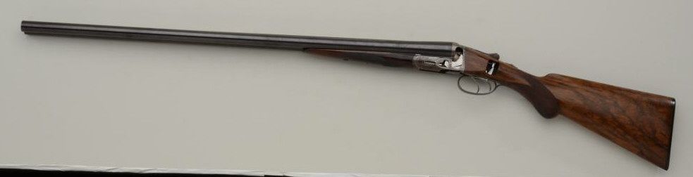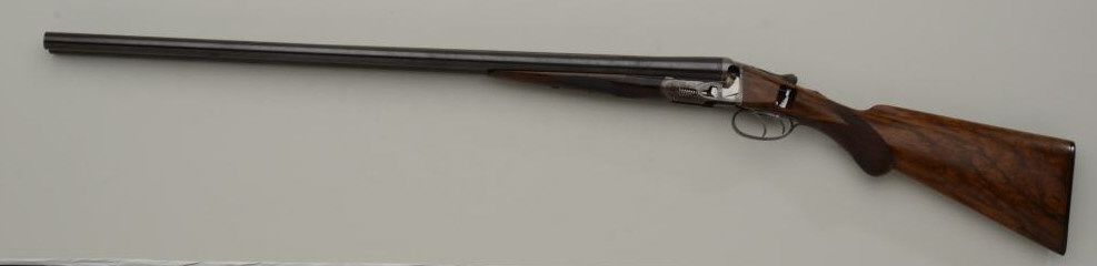 A. H. Fox Gun Company factory cutaway or skeleton model for demonstration, serial number 7877. The gun measures 46 ½” overall with 30” barrels showing double triggers, standard extractors and cutaway windows forviewing mechanism. The barrels retain 95% to 98% original blue that are drifting and toning slightly and the markings on barrel are sharp and show Krupp steel. The frame has drifted to a brown with traces of blue. Thetrigger guard shows 50% thinning blue. The forend is very good but the butt stock has been broken and repaired nicely at the top of wrist. The action is tight and the bores show no use and we do not think it was madeto function just to show the interior as a salesman or display Gun. No collection of A. H. Fox would be complete without a factory cutaway and knowledgably collectors know of only one other cutaway. Est.: $2500-$5000