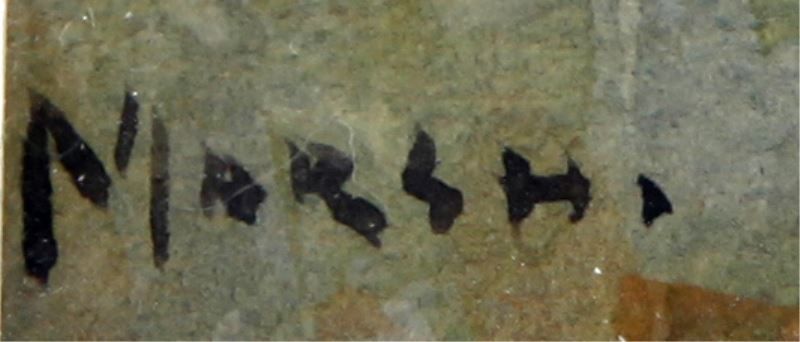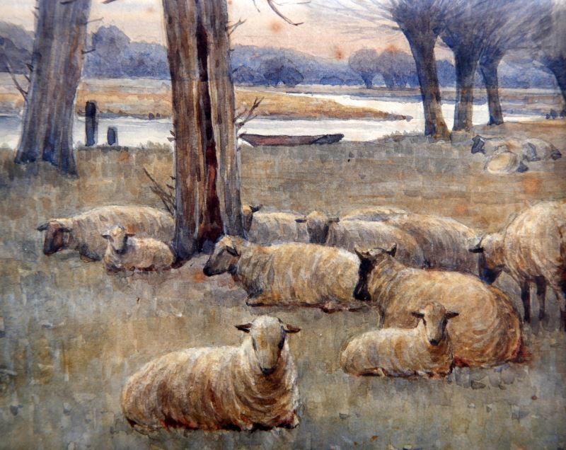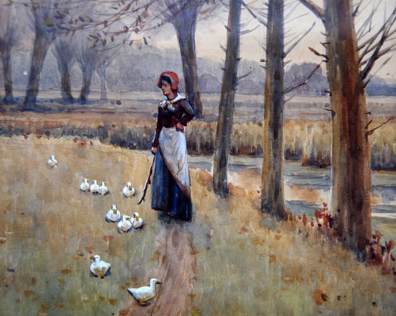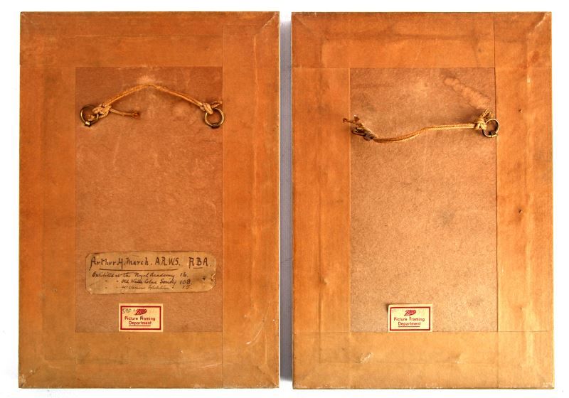 Arthur Hardwick Marsh (British, 1842-1909) pastoral pendant pair of watercolors depicting a duck herder and resting sheep. Reverse of one marked "Arthur H. March A.R.W.S. RBA Exhibited at the Royal Academy, 16. Old Water Colour Society, 108. Various exhibitions, 15." Each painting measures approximately 9 by 6.25 inches, 10 by 7 inches framed, both signed in lower left. Both have foxing and spotting, overall in very good condition.