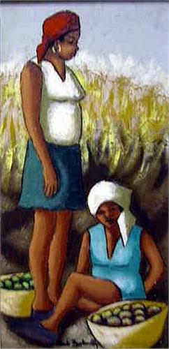 A HAITIAN OIL ON CANVAS, scene with two women, on