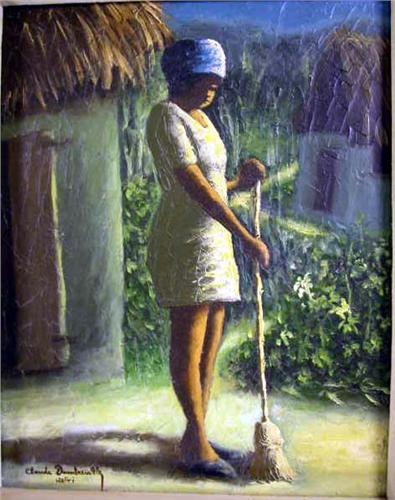 A HAITIAN OIL ON CANVAS, scene with woman holding broom, with house behind her, signed lower left, Claude Dambreville, (Haitian, b. 1934), wood molded frame, 19" x 15"
