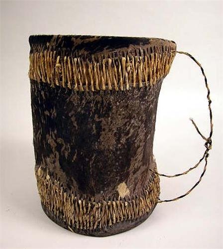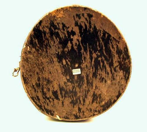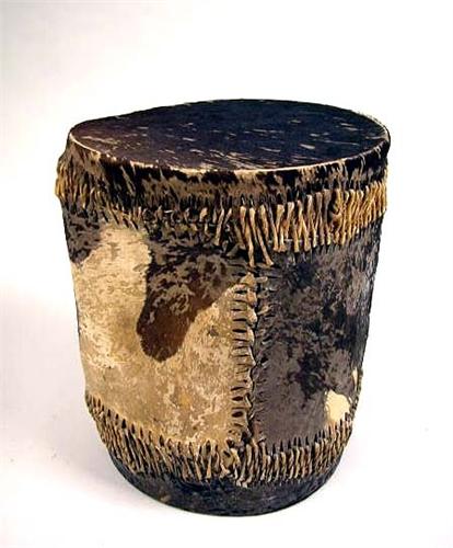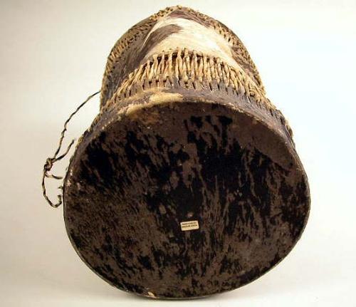A HAND CARVED AND HAND MADE SKIN DRUM The underside fitted with a sticker saying "Made in Kenya", 14"h x 12"diameter