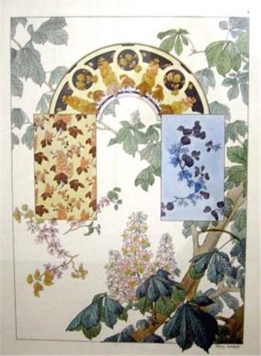 A HAND COLORED ENGRAVING; depicting blossoming trees and related wallpaper blocks, signed ll, Henry Lambert, 16"h x 12"w