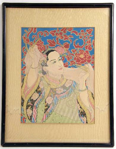 Published December 28, 1950. Signed in pencil l.l.c. above the Peach seal, print title and seals of the carver, Kentaro Maeda, and printer, Tetsunosuke Honda, l.r. margin verso with special red seal with artist`s chop "PJ" in script, paper with Jacoulet`s personal Japanese watermark. Paul Jacoulet (French, 1896-1960) is best known for his striking portraits of the natives of Asia and the South Seas, designing and producing in the course of his lifetime over 160 woodblock prints. Following in the collaborative tradition of ukiyo-e printmaking, Jacoulet recruited talented carvers and printers who could duplicate the richly-detailed lines of his drawings and watercolors, frequently using from 200 to 300 wood blocks, which were rendered even more exquisite by the use of costly materials like mica, crushed pearl and powdered metals. Born in Paris in 1896, Jacoulet was raised in Tokyo from an early age after his university professor father Frederic was hired by the Japanese government to teach French to young aristocrats. Jacoulet was fluent in the Japanese language and the country`s social customs, and he studied a wide range of traditional arts. Around 1931, he began to learn woodblock printmaking; two years later he established the Jacoulet Institute of Prints and began publishing his own designs. Jacoulet remained in Japan through World War II and continued to produce prints up until the time of his death in 1960. Although many of his prints were sold by subscription, he also sold a number of prints to American military officers stationed in Japan after the war. Reverse shows slight toning and tape shadows but front and image within plate line is excellent. Great mica highlights. Water staining to raw silk mat, not affecting image.