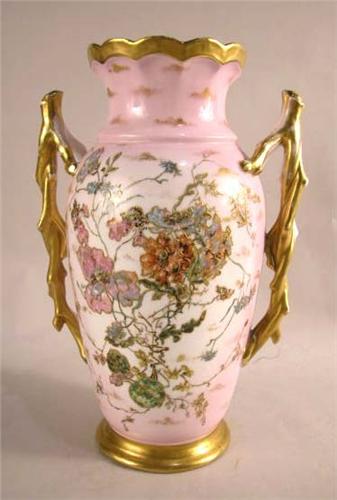 A HAND PAINTED AND PARCEL-GILT TWO HANDLE PORCELAIN VASE; Marked, Elite Limoges, French, with twig-form handles and floral decoration (wear to surfaces) Height 15 1/2"