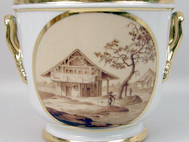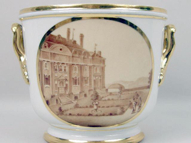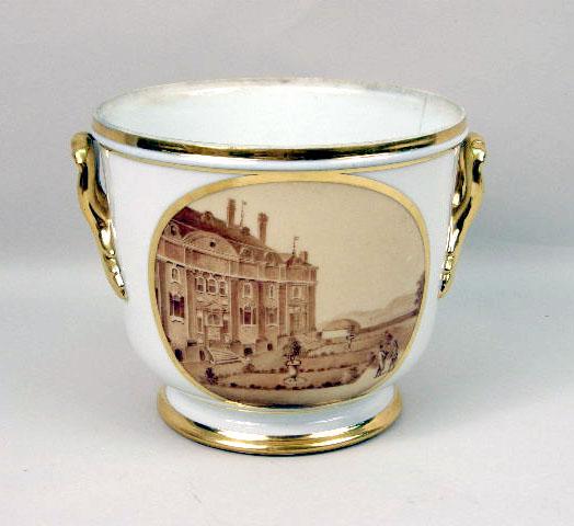 A HAND-PAINTED PORCELAIN DOUBLE-HANDLED CACHE POT