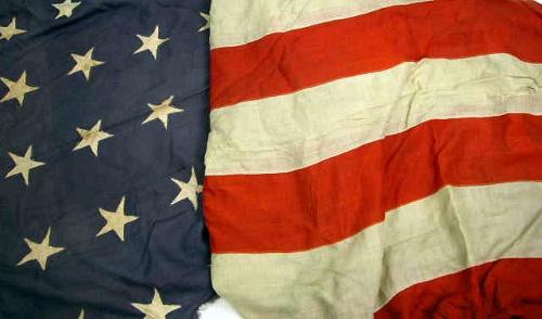 A HAND-SEWN FORTY-TWO STAR AMERICAN FLAG; worn and repaired, 10'w x 15'l