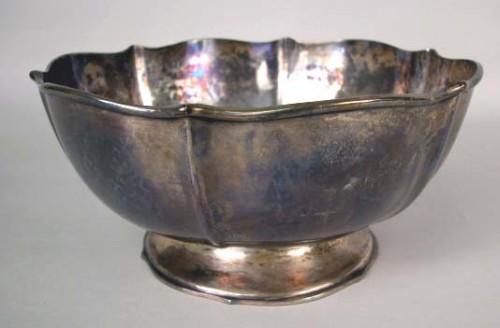 A HAND WROUGHT STERLING SILVER SCALLOPED FOOTED BOWL; James T. Woolley, 5"h x 9"dia., apx 22 T.O.