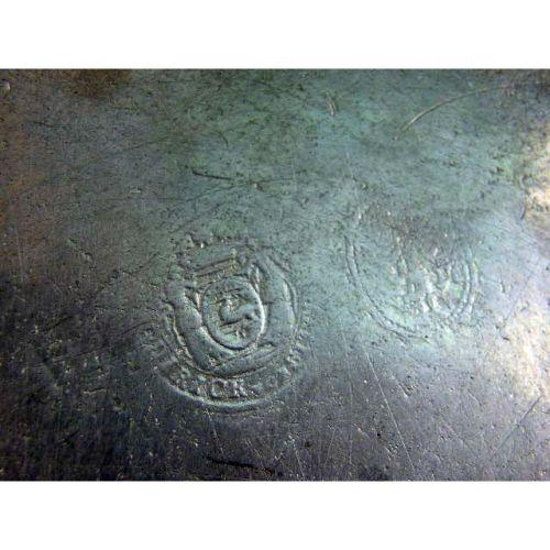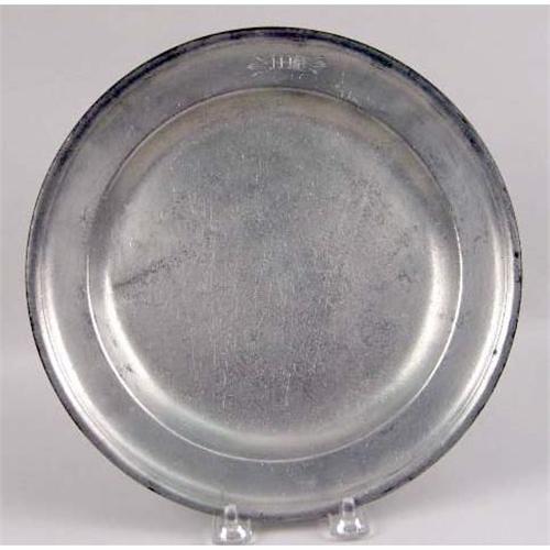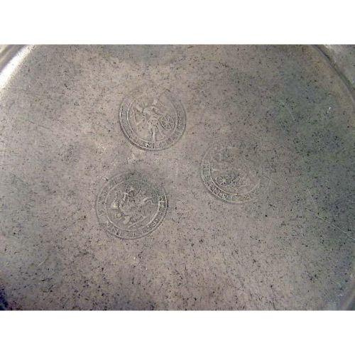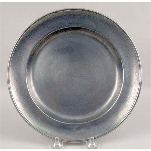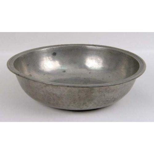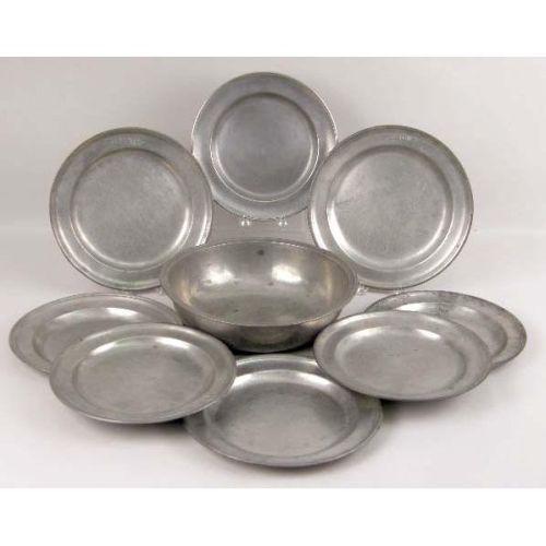A HANDHAMMERED PEWTER BASIN<BR><BR>Stamped Townsend and Compton, Made in London, 11 1/2"dia. Together with eight pewter plates, each with a marker`s mark, wear, 9 pieces