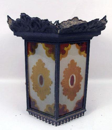 A HANGING TIN LANTERN WITH PAINTED GLASS PANELS