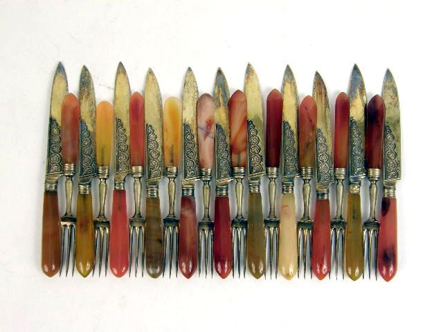 A HARDSTONE AND GILT ENGLISH SILVER FRUIT SET
