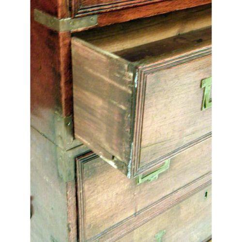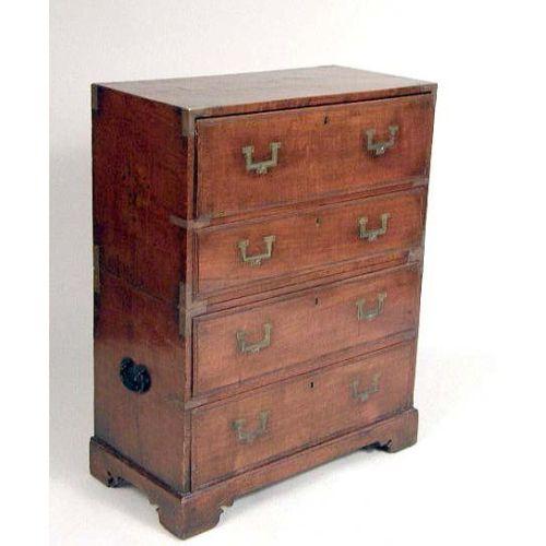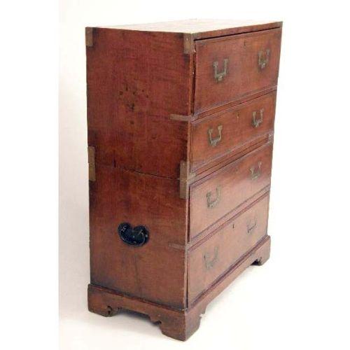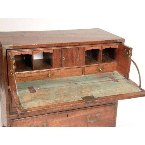 A HARDWOOD ANGLO-INDIAN CAMPAIGN CHEST AND BUTLER`S DESK<BR><BR>the hinged front opening to reveal pigeonholes, a prospect and two short drawers. Fitted with a secret compartment. 36" high x 28" wide x 13 1/2" deep.