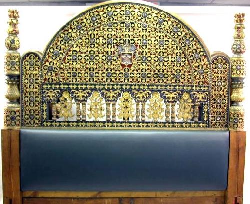 A HEAVILY CARVED AND POLYCHROME-DECORATED BEDSTEAD; with arched crest flanked by turned finials above square legs, some wear. 6'8"h x 6'6 1/2"w x 7'8"l
