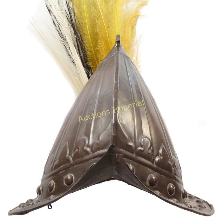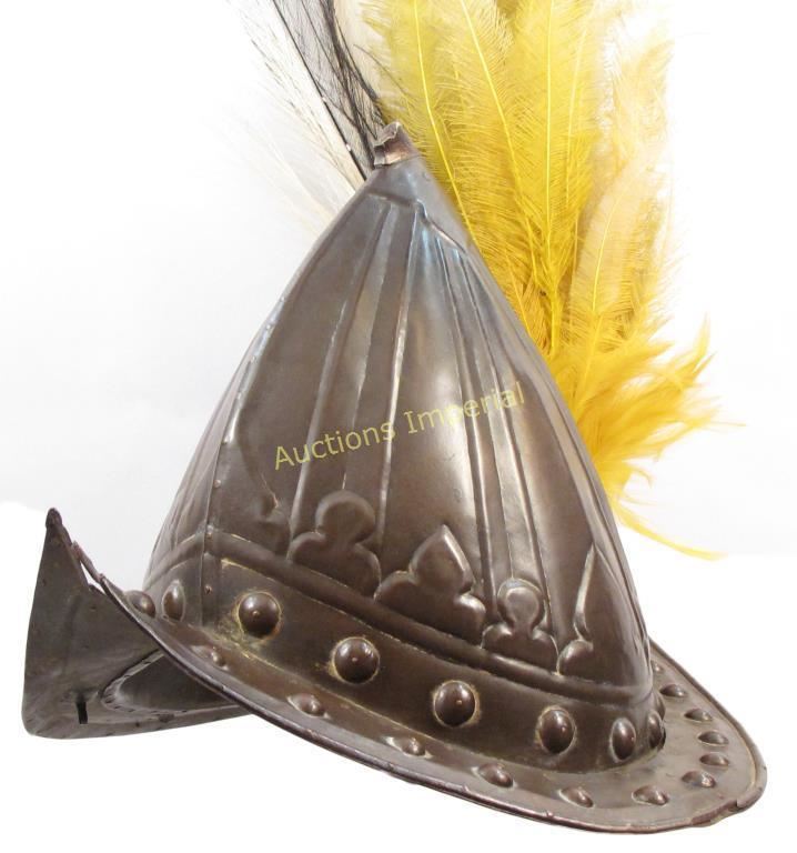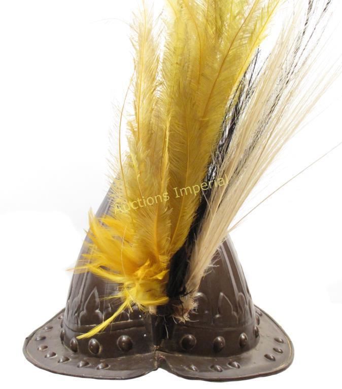 An extremely rare brass helmet in the form of a European morion, which was introduced by the Portuguese in 1525. Worn by the Bodyguard of the Sultans of Sulawesi. The skull formed in two halves connected with tiny rivets and finely embossed with tapering panels which converge at the peak. The gracefully-curved brim of characteristic form with cusped termini, studded with large bosses and separately applied roped border, triple plumeholder affixed to the obverse retaining its plumes. Deeply patinated overall. 17th century or later. Minor dents and loss to finial, some rivets lacking. For another of the same group see, A. Van Zonneveld, Traditional Weapons of the Indonesian Archipelago (21001: Leiden. Zwartenkot.) p.51. Height 23.3 cm.
