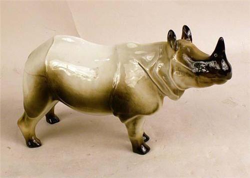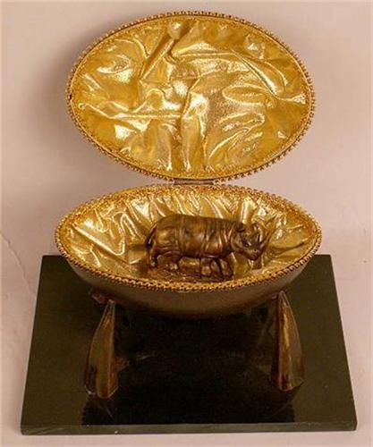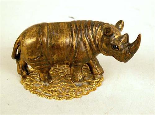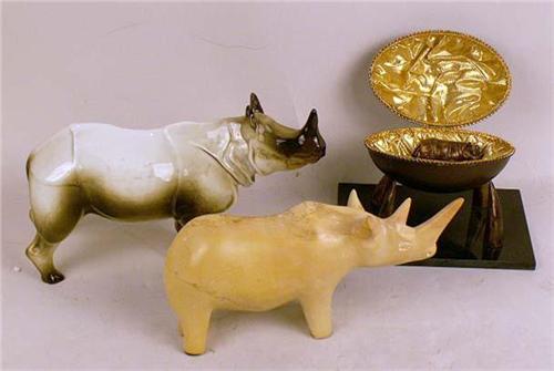 Containing a rhinoceros figure and a note stating "Made by Sally Gatlin, Tall City, Texas." Together with two figures of Rhinos, Box: 6"h x 7"w x 5"d