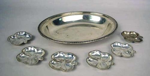 A HIRSCH STERLING SILVER OVAL BOWL; 10"l, Together with six sterling silver four-leaf clover-form nut dishes, losses, Apx. 20 T.O.
