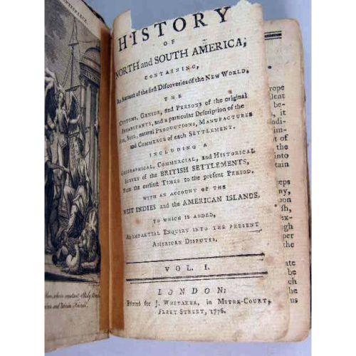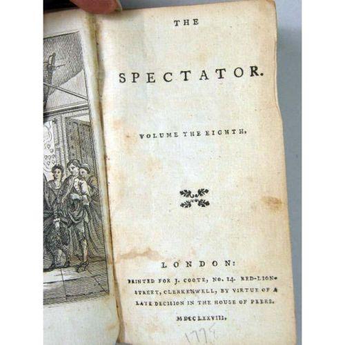 A HISTORY OF NORTH AND SOUTH AMERICA, VOLUME I<BR><BR>published by J. Whitaker, Fleet Street, London, 1776. Includes a discussion of the coming war with the colonies. Together with Isaac Walton`s "The Complete Angler", published by Bradbury & Evans, Whitefriars London, circa 1856, "The Spectator, Volume VIII, 1778", "Rasselas" by Samuel Johnson, published by Silas Andrews, Hartford, CT 1825 and "The Fourth Part of Miscellany Poems", printed by J. Tonson in the Strand, London, 1727. 5 pieces.