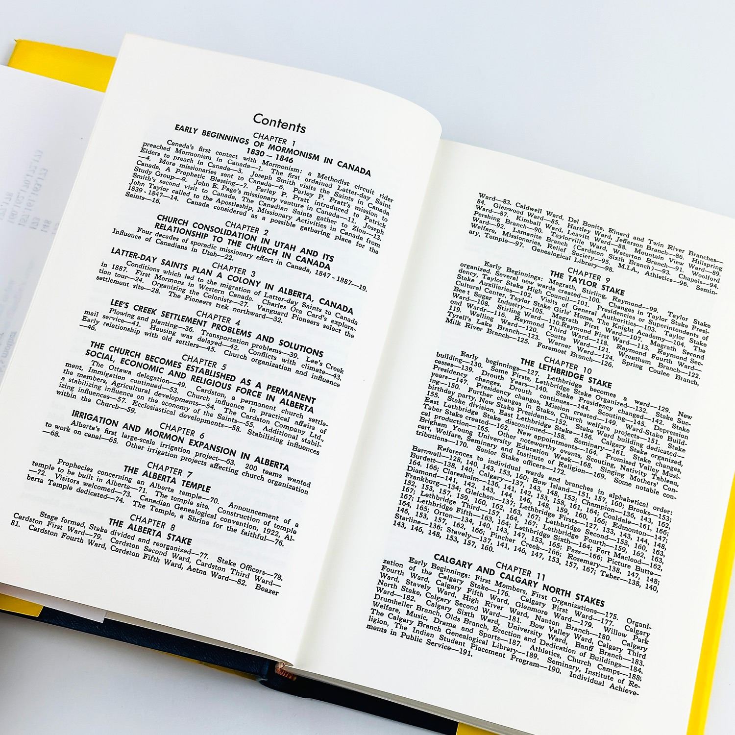 #8278 - A CANADA CENTENNIAL PROJECT. COPYRIGHT 1968 BY THE PRESIDENT OF THE LETHBRIDGE STAKE, A CORPORATION SOLE. PRINTED BY THE LETHBRIDGE HERALD - HARDCOVER WITH DUST JACKET - 302 PAGES. MEASURES: 9.5” (24 CM) BY 6.5” (16.5 CM)