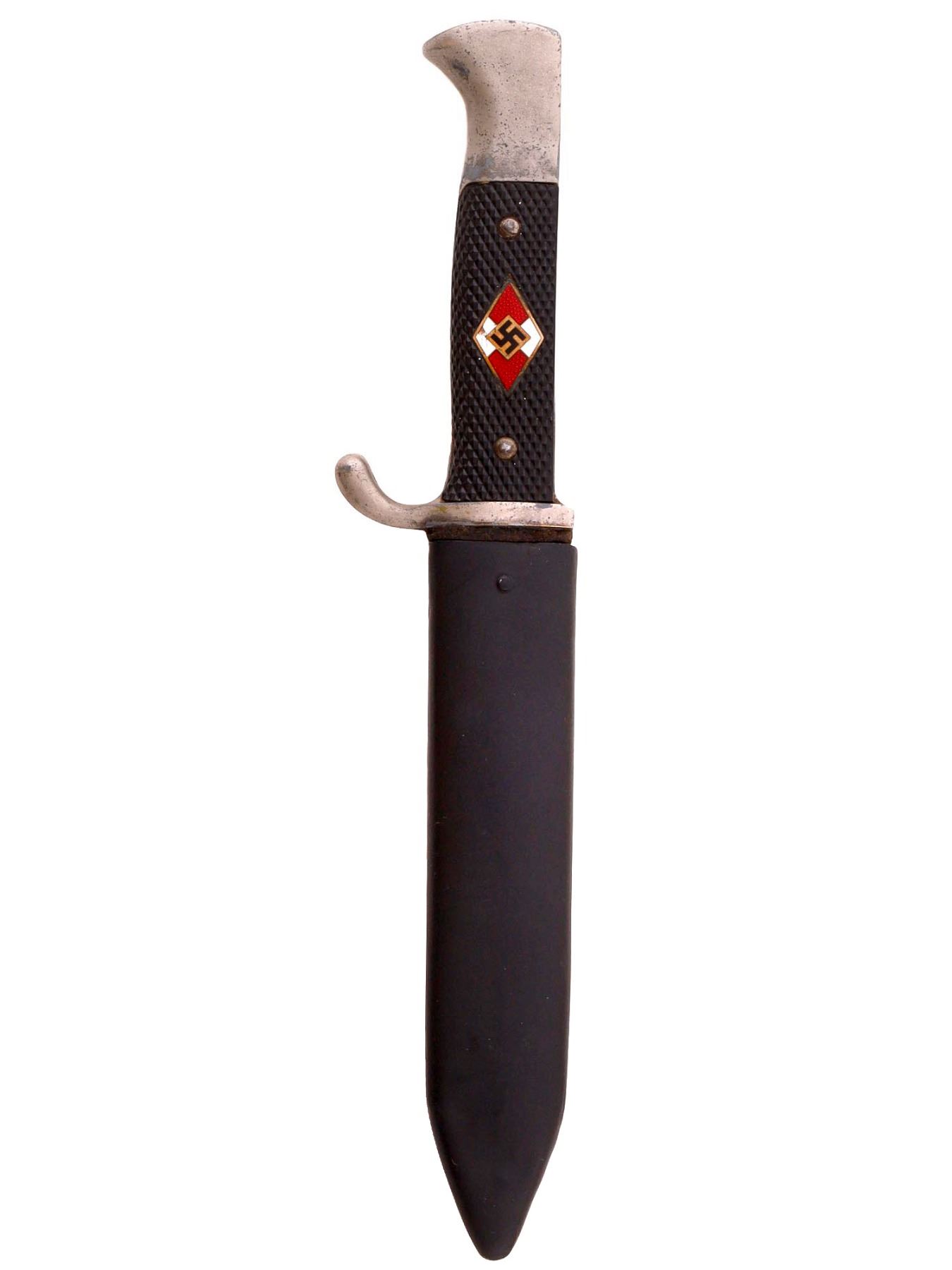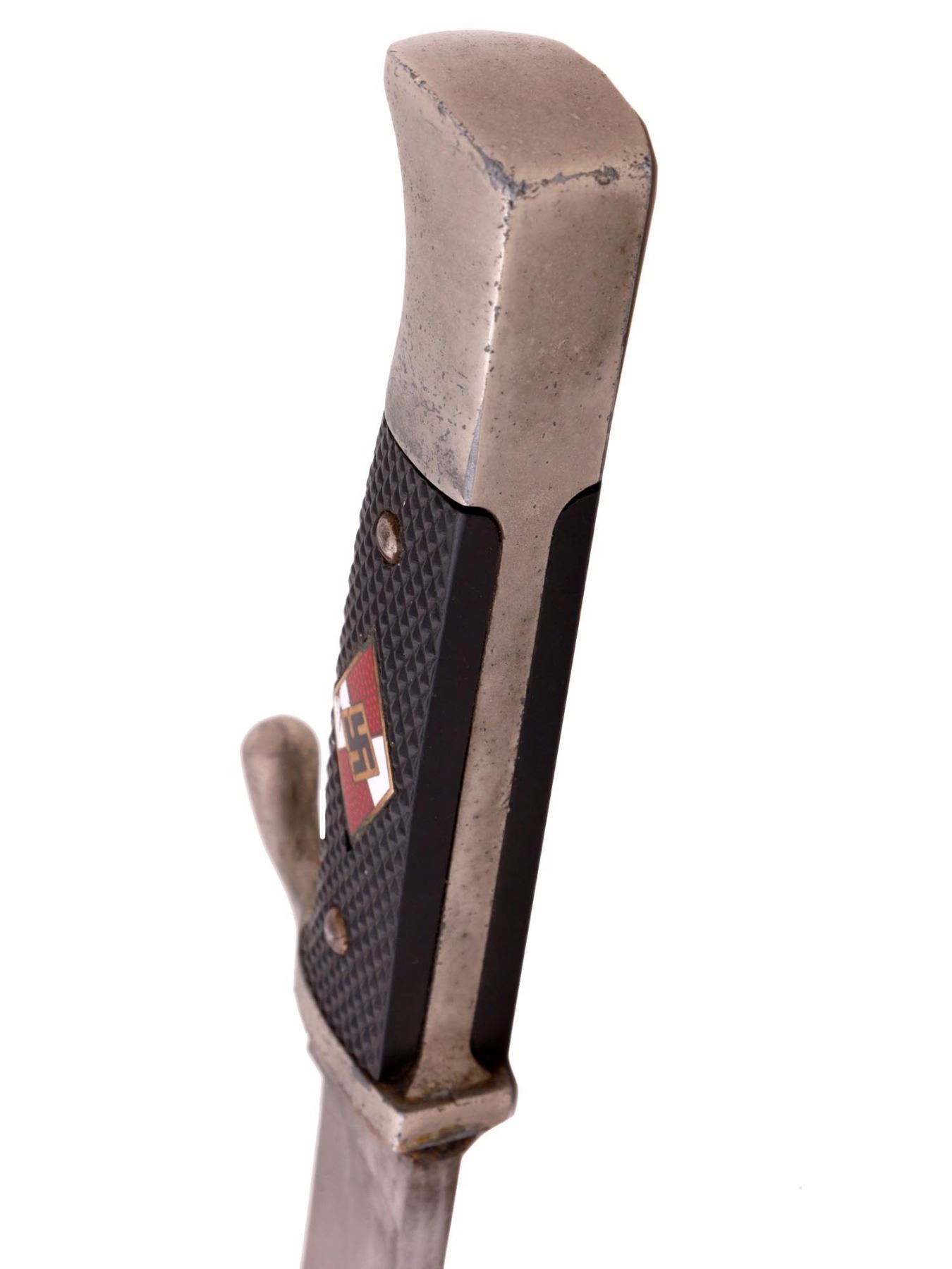This Hitler Youth knife is in good condition, with a minor dent at the tip of the scabbard and some surface staining on the metal parts of the handle. The Hitler Jugend insignia on the handle has a small chip on the left white diamond but is otherwise intact and clear. Ther's some minor oxidization at the tips of the top and bottom points of the insignia. Everything is still tight, and the blade fits the scabbard well.