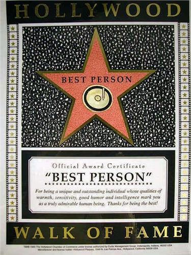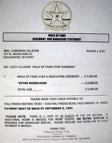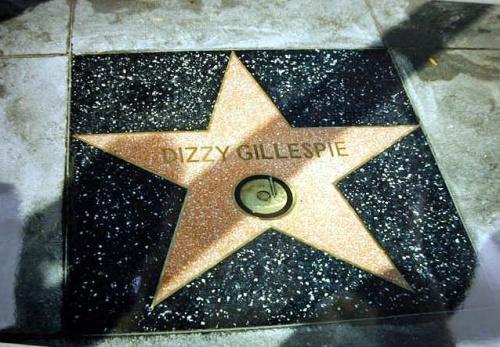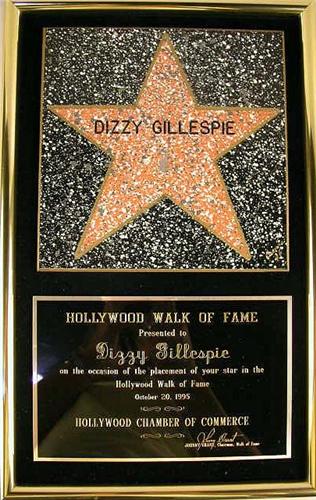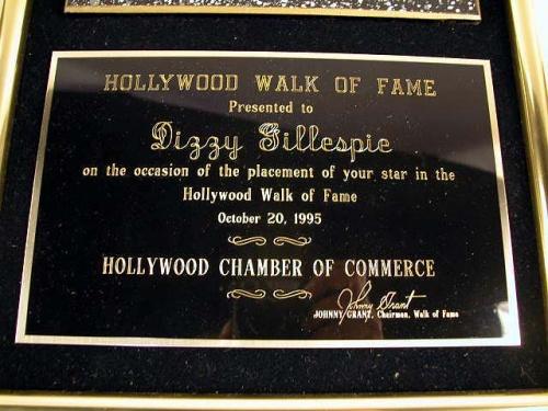 A HOLLYWOOD WALK OF FAME PLAQUE Presented to Dizzy Gillespie, October 20, 1995, together with a copy of a bill from the ceremony, a laminated walk of fame "Best Person" certificate, and 35 mm pictures from the dedication and ceremony, apx. 15 pieces