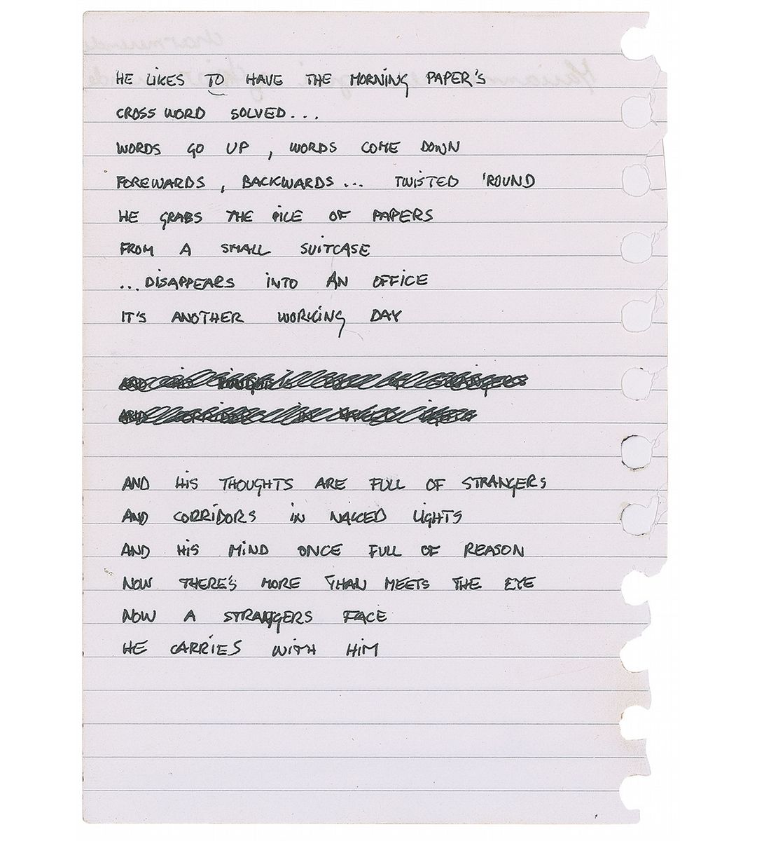 Handwritten lyrics by Pal Waaktaar, unsigned, one lined notebook page, 4.25 x 6, no date. Waaktaar pens the lyrics to the first two verses of the song ‘Train of Thought,’ which appeared on their debut album Hunting High and Low in 1985. In part: “And his thoughts are full of strangers, / Corridors in naked lights / And his mind once full of reason / Now there's more than meets the eye / Now a stranger's face / he carries with him.” In fine condition. Accompanied by a letter of authenticity from John Ratcliff, who discovered, produced, and managed A-Ha between 1983 and 1988.